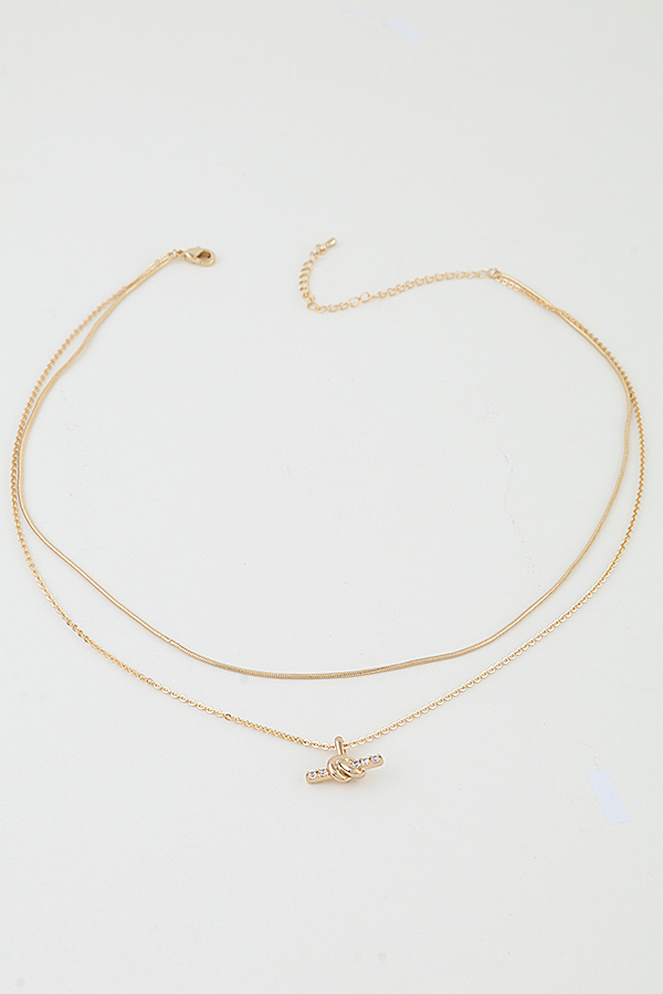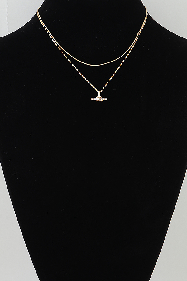- * This Bejeweled Knot Bar Necklace from H&D Accessories features a layered design with a slim smooth chain and a delicate link chain, centered with a polished bar pendant accented by a sparkling knot detail, creating a subtle yet eye-catching look. It adds a refined touch to a casual knit sweater for a weekend coffee run or elevates a minimalist blouse for a day at the office, making it a versatile everyday essential.
