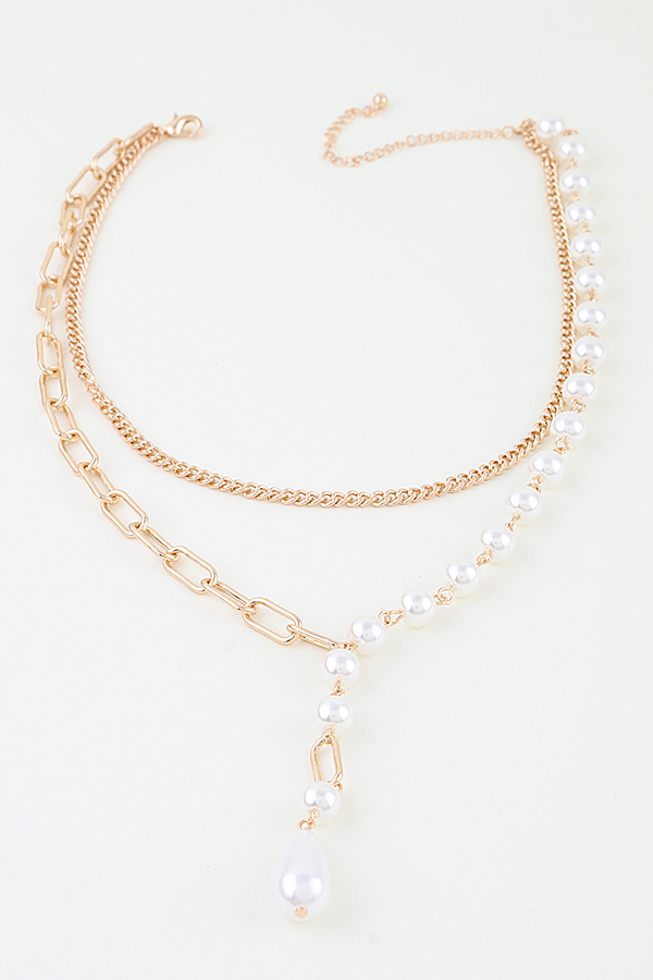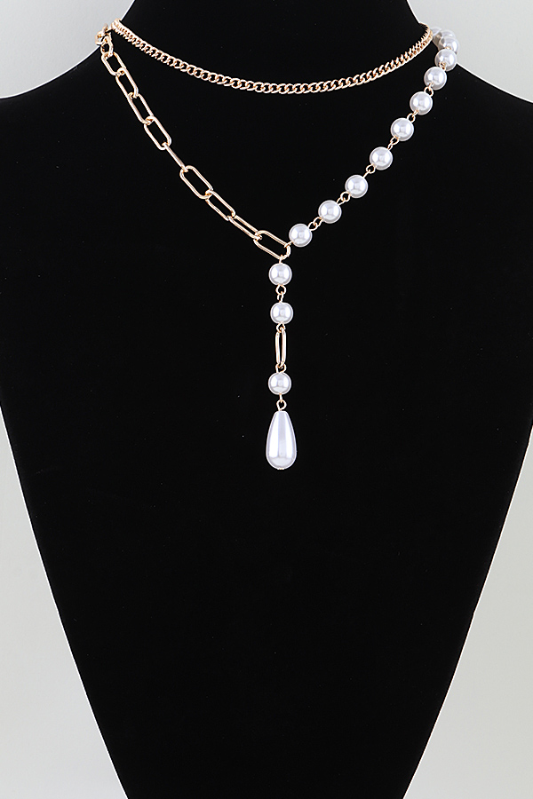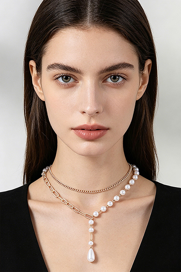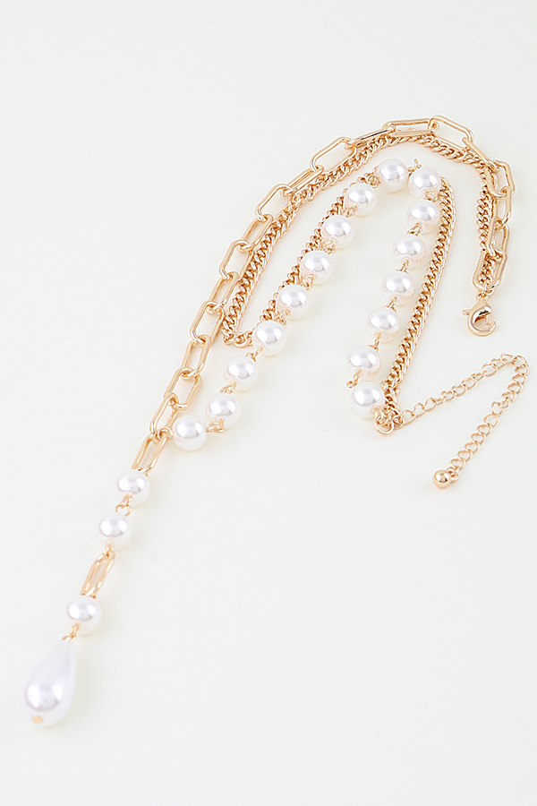 - * Multi Beaded Chain Drop Necklace from H&D Accessories features a layered design with three distinct strands: a delicate cable chain, a bold paperclip chain, and a strand of lustrous round beads, with the beaded strand extending into a sleek lariat-style drop that culminates in a striking teardrop-shaped bead accent, finished with an adjustable extension chain for a customizable fit, blending modern chain textures with timeless bead elegance to elevate everyday outfits, office looks, and evening ensembles alike.