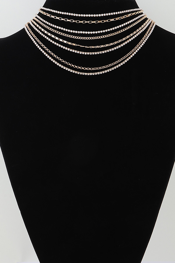 • * This is a Multi Rhinestone Chain Drop Necklace from H&D Accessories. It features a striking layered design with multiple chains, each embellished with sparkling rhinestones, creating a voluminous and glamorous look. Displayed on a black mannequin, the necklace drapes elegantly around the neck, exuding a sense of bold sophistication. It’s perfect for making a statement at a high-profile event like a fashion gala or a New Year’s Eve party, where its intricate multi-rhinestone chain design will ensure you capture every eye in the room.