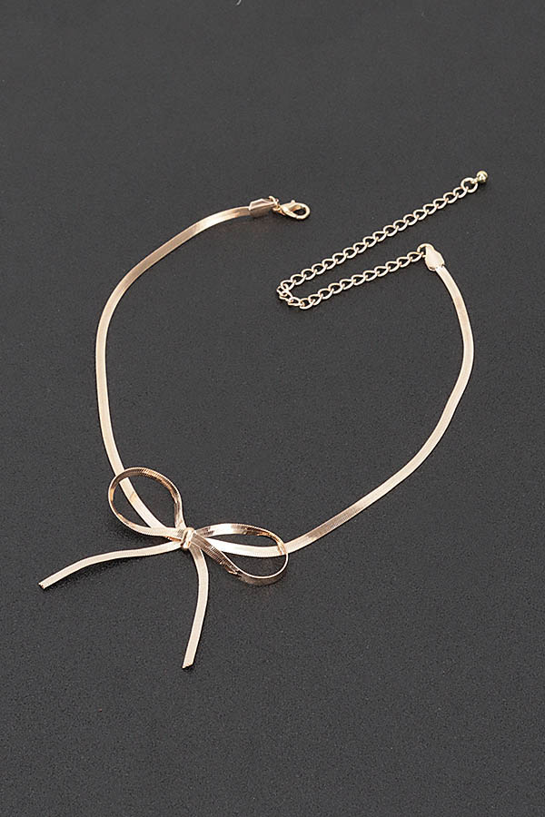 - * Introducing the "Metal Snake Chain Ribbon Necklace" from H&D Accessories! This exquisite gold necklace features a beautifully crafted bow, adding a touch of sophistication and femininity to any outfit. With its sleek design and high-quality materials, the Metal Snake Chain Ribbon Necklace is the perfect accessory to elevate your style and make a statement. Embrace the timeless beauty of this necklace and let it become a symbol of your elegance and grace.