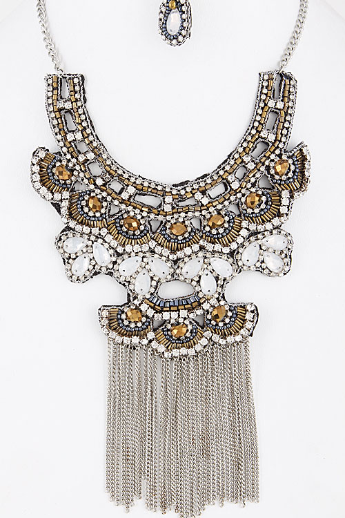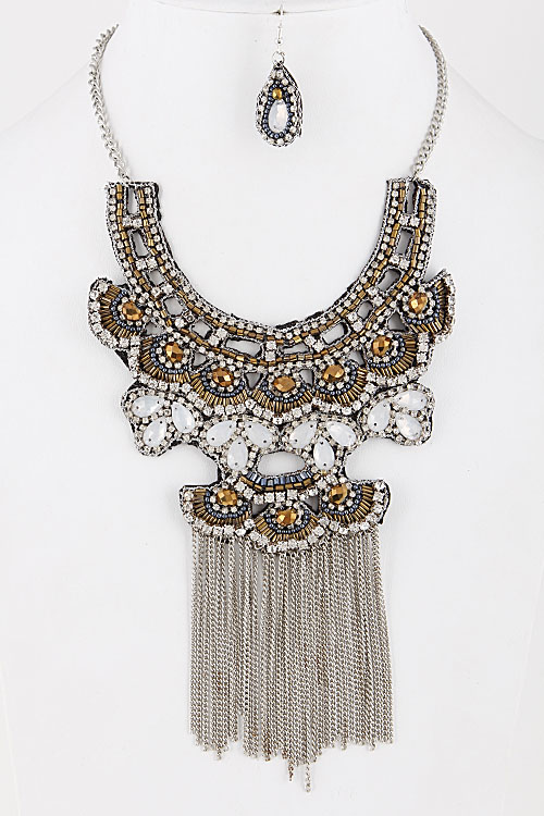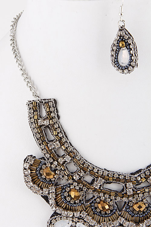 • * Gatsby inspired Statement Necklace Set with Encrusted Rhinestone and Bead Detail 5JAC8 * 13.5" approx.