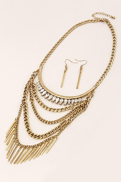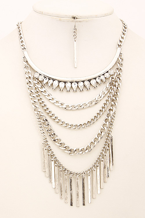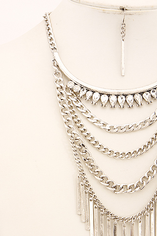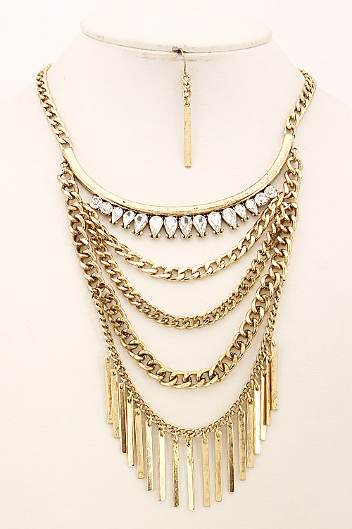 • * Multi Layered Statement Necklace Set With Fringes And Rhinestones 6CAC6 * 12 X 5" approx.