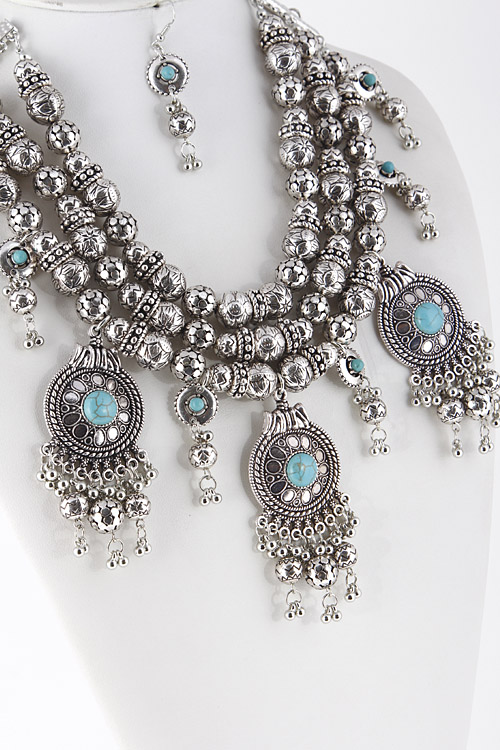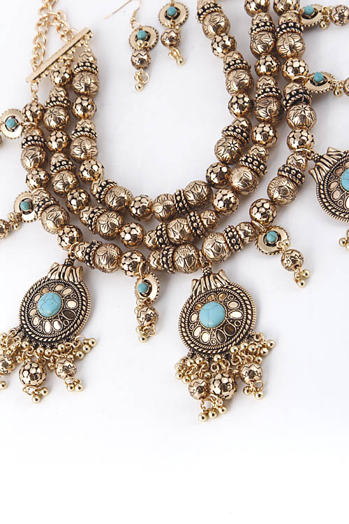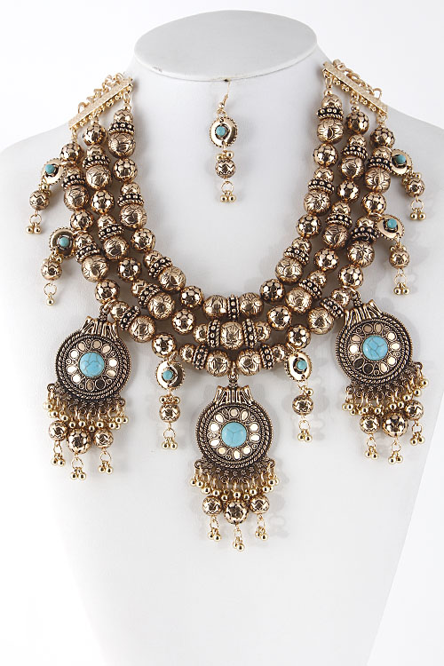 - * Antique Stone Ornament Dangle Statement Necklace 5DBG * 18" approx.