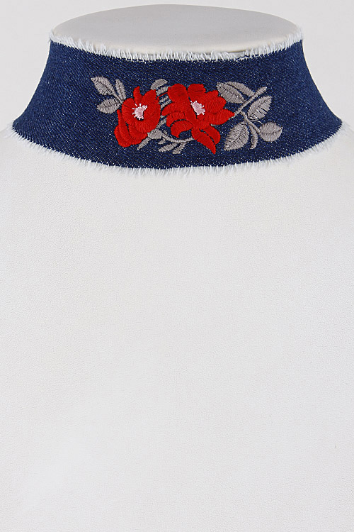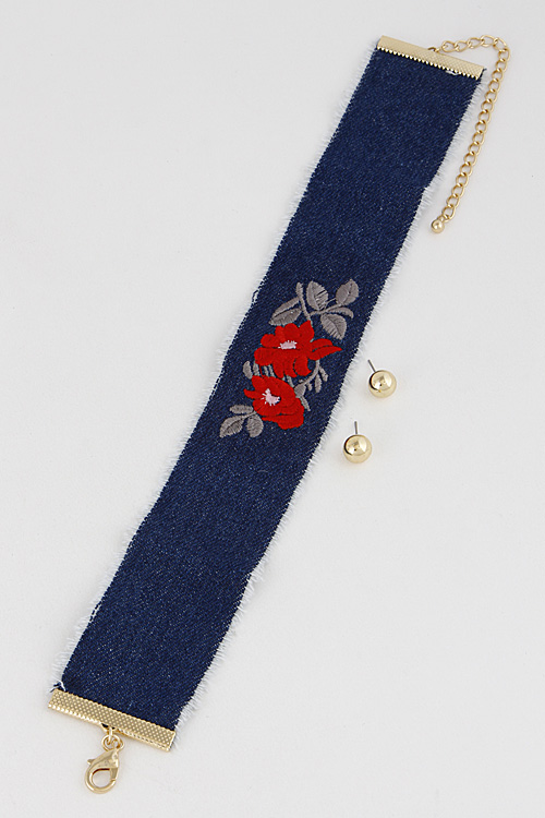 - * Denim Choker Necklace With Red Roses Details 7CBA9 * 2 x 12" approx.