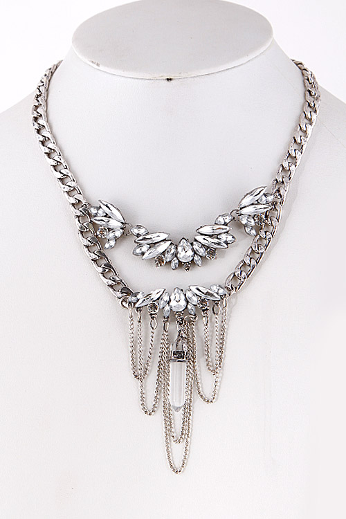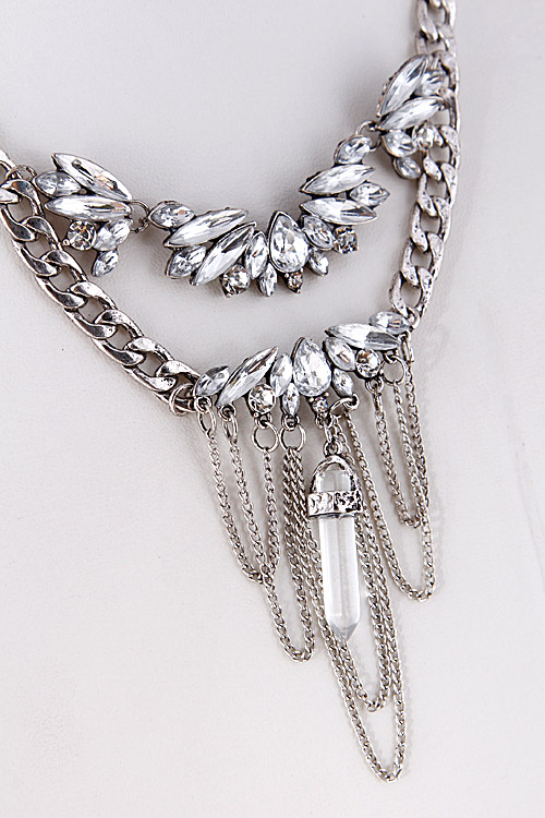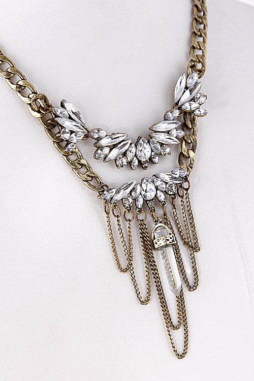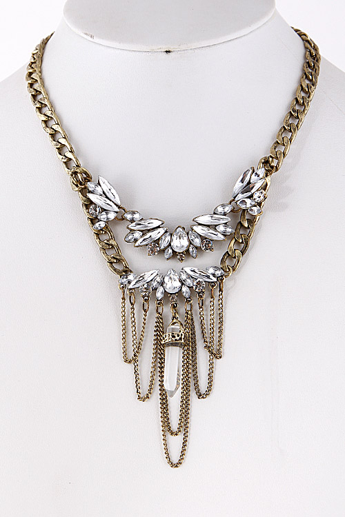 • * Spiky Rhinestone Statement Attached Chain Necklace 5EBJ11 * 14 x 3" approx.