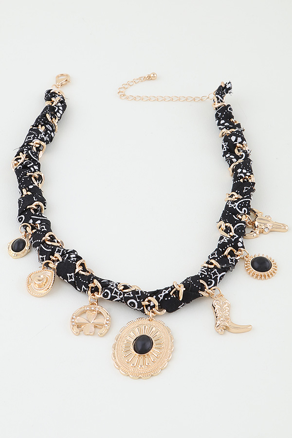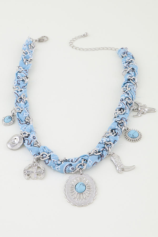 - * This necklace features a unique design with intertwined chains and fabric, adorned with various Antique Wild West Charms like a bull skull, cowboy boot, horseshoe, and decorative medallions. It's the Antique Wild West Charms Fabric Necklace from H&D Accessories, perfect for adding a touch of retro Western flair to your outfit, suitable for themed parties or casual looks that need a distinctive vintage vibe.