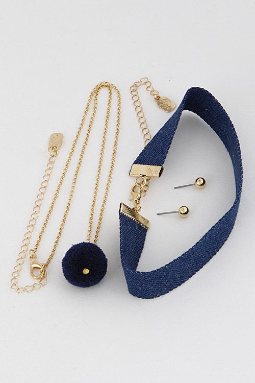 - * Pom Pom Detailed Denim Choker Necklace 7ABG2 * 0.8 x 10" approx.