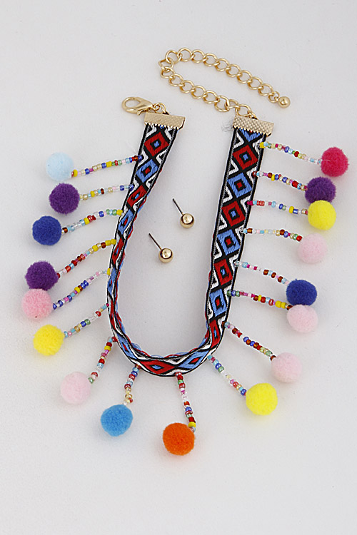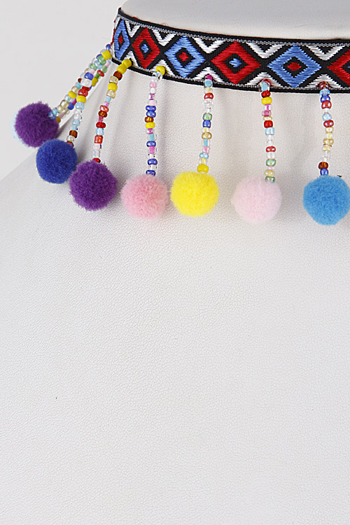• * Pom Pom Tribal Inspired Choker Necklace 7CBC7 * 2 X 12" approx.