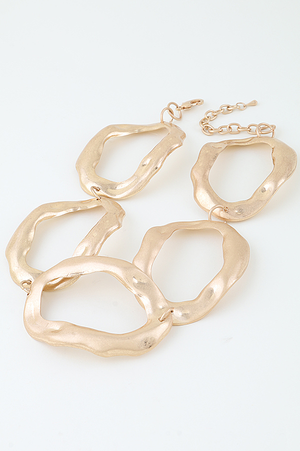 - * This Hammered Open Disc Choker Statement Necklace from H&D Accessories features three irregular, open-disc links connected by small metal fasteners. Each disc boasts a textured hammered finish, lending an artisanal, organic edge to the bold, sculpted shapes. The choker silhouette sits close to the neck, with the oversized, asymmetrical discs creating a striking, dimensional profile that balances tactile detail with modern, statement-making design.