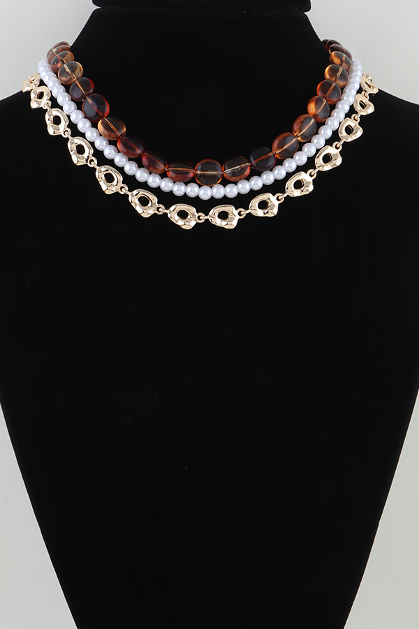 • * Multi Polished Stone Beaded Necklace from H&D Accessories features a layered design with three distinct strands. The top strand showcases large, translucent oval stone beads with natural marbled patterns. Below it, a strand of small, round pearl-like beads adds a delicate touch, while the bottom layer consists of a chunky, polished metal chain with unique open-link connectors. This combination of organic stone textures and sleek metal elements creates a bold, modern aesthetic, making it a versatile and eye-catching addition to any jewelry collection.
