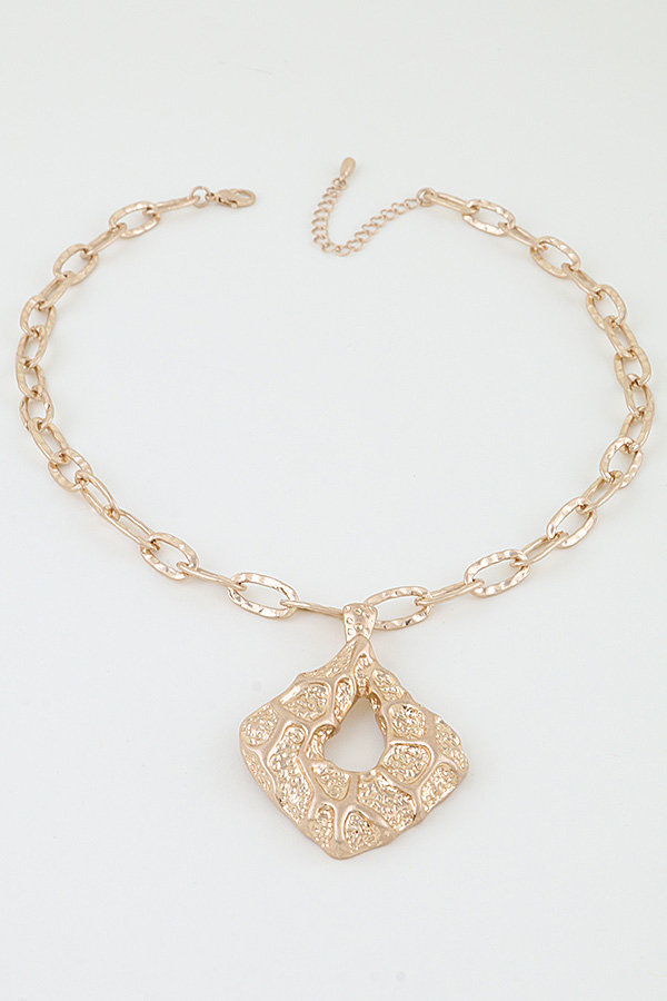 • * Hammered Diamond Cut Chain Necklace from H&D Accessories features a sleek paperclip-style chain with a textured, hammered finish, paired with a large, diamond-shaped pendant. The pendant is adorned with intricate, embossed patterns and a central cut-out, adding depth and visual interest. Expertly crafted with a reflective, polished surface, this necklace blends modern geometric design with artisanal texture, making it a bold, statement-making addition to any jewelry collection.
