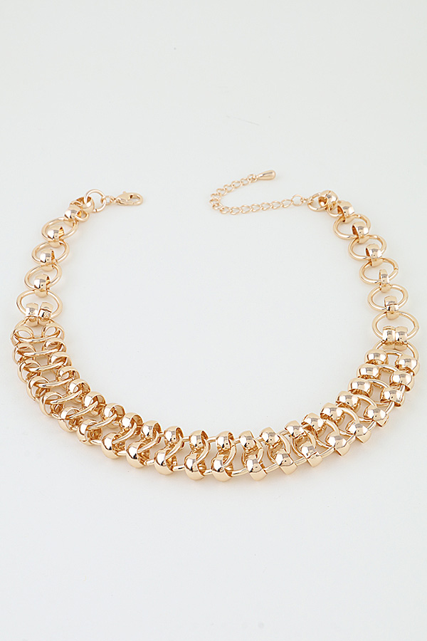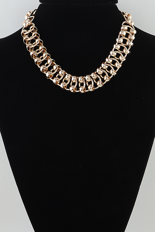 - * Multi Triple Loop Chain Statement Necklace from H&D Accessories features a bold, chunky design with interlocking triple-loop metal links. The polished, reflective chain creates a dynamic, textured silhouette, forming a wide, eye-catching collar that sits prominently on the neckline. Expertly crafted with a sleek, shiny finish, this necklace blends industrial-inspired edge with modern sophistication, making it a striking, statement-making addition to any jewelry collection.