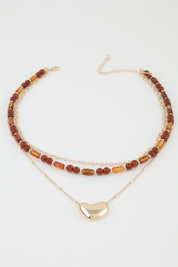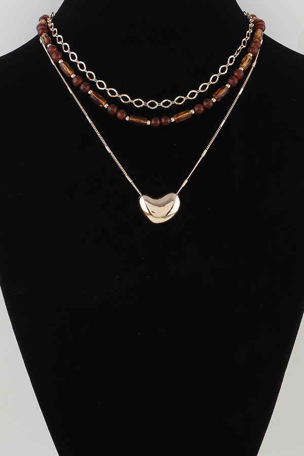 • * Multi Polished Pendant Beaded Necklace from H&D Accessories features a layered design with three distinct strands. The top strand is a delicate, open-link metal chain, while the middle strand showcases a mix of round and cylindrical stone beads with natural marbled patterns. The bottom layer is a sleek, thin chain adorned with a large, polished heart-shaped pendant at its center. This combination of organic stone textures, sleek metal elements, and a bold pendant creates a modern, sophisticated aesthetic, making it a versatile and eye-catching addition to any jewelry collection.