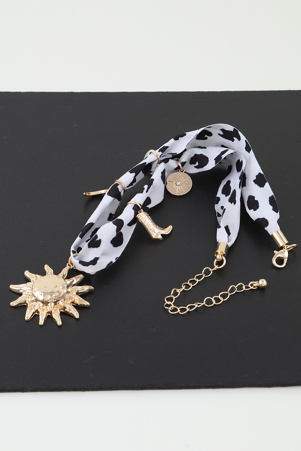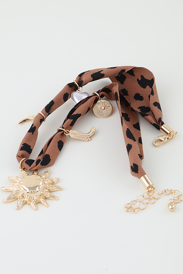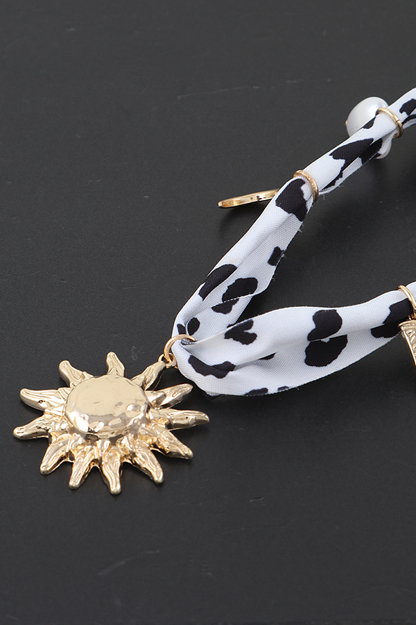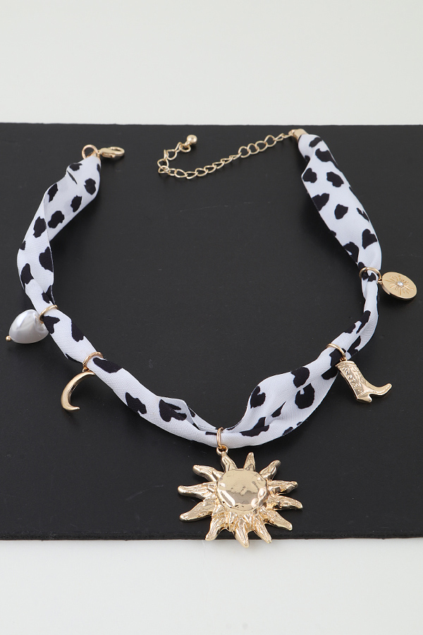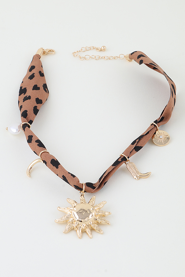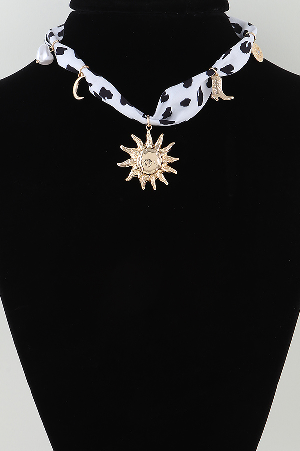 - * This necklace features a fabric band adorned with various charms including a sun motif, a cowboy boot, a crescent, and a coin-like piece, along with a pearl accent. It's the Rising West Fabric Charms Necklace from H&D Accessories, perfect for adding a distinctive Western-inspired touch to your attire, ideal for those who want to infuse their look with a blend of retro and bold elements