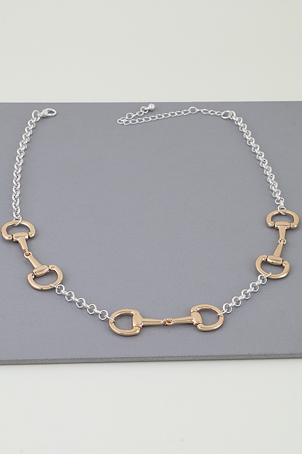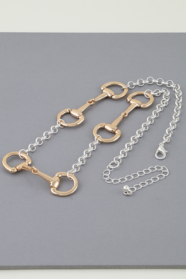 • * This Multi Horseshoe Toggle Chain Necklace from H&D Accessories features a delicate silver-toned link chain, adorned with three polished horseshoe snaffle bit pendants that evoke equestrian sophistication. Ideal for country outings, equestrian events, or elevating everyday office wear, it adds a refined, classic charm to any ensemble. The two-tone metallic contrast creates visual depth, while the adjustable extender ensures a personalized fit, making it a versatile staple for lovers of timeless, horse-inspired styling.