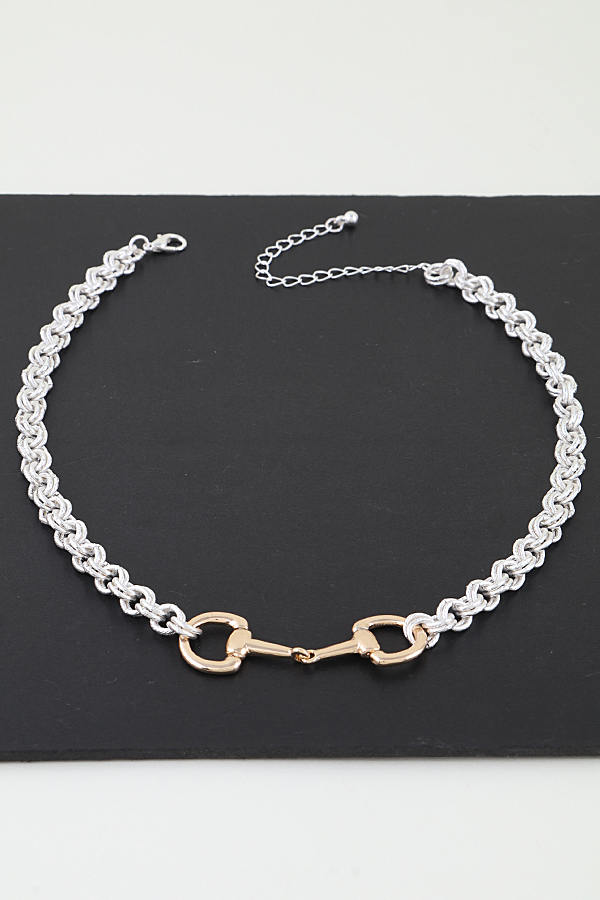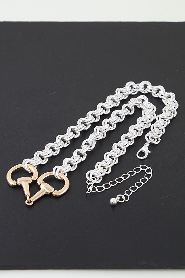 - * This Multi Horseshoe Pendant Chain Necklace from H&D Accessories features a textured silver-toned rope chain, anchored by a polished two-tone horseshoe snaffle bit pendant that evokes equestrian elegance. Ideal for casual country outings, equestrian events, or adding a sophisticated edge to everyday wear, it brings a timeless, rustic charm to any ensemble. The contrast between the woven chain and the sleek metallic pendant creates visual interest, while the adjustable extender ensures a personalized fit, making it a versatile staple for lovers of classic, equestrian-inspired styling.