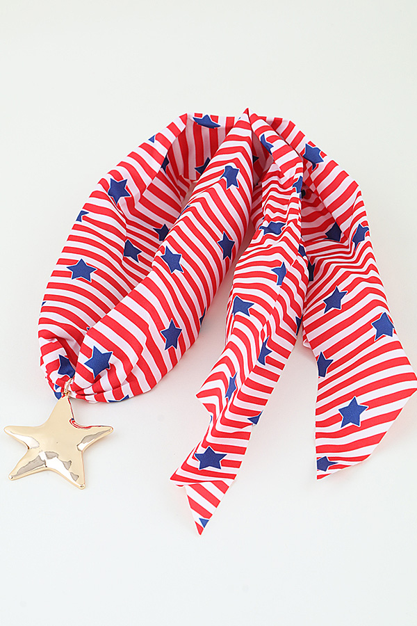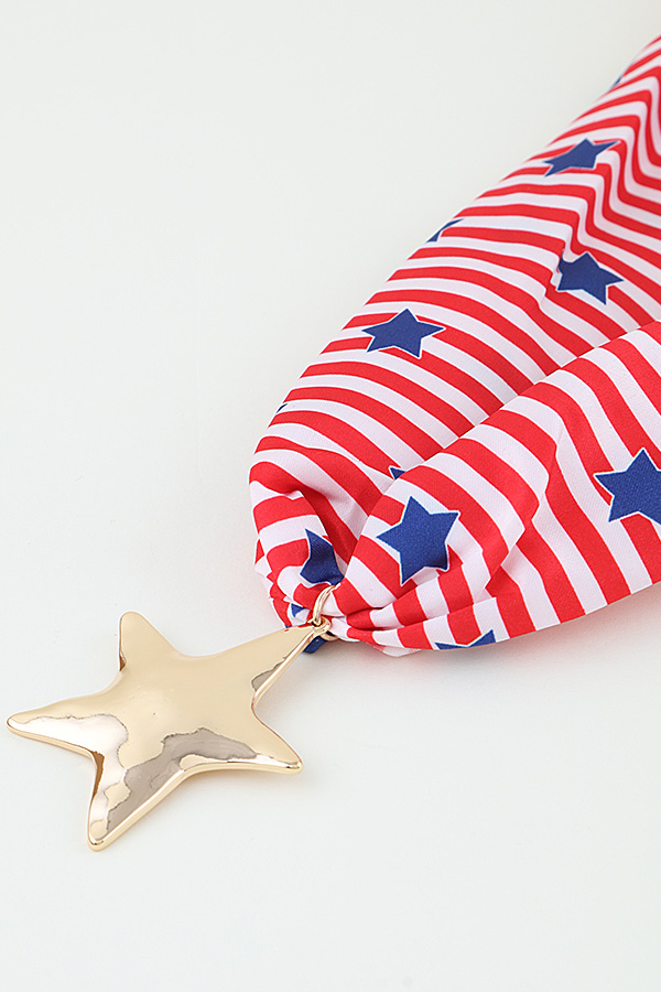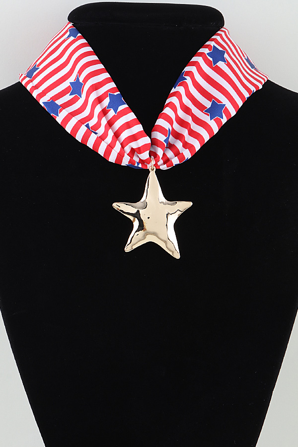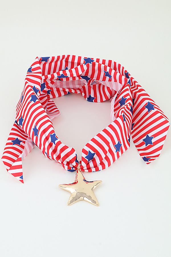 - * This Hammered Star Scarf Necklace from H&D Accessories features a patriotic red-and-white striped scarf band adorned with blue star motifs, paired with a large, textured hammered gold star pendant that exudes bold American spirit. Ideal for Fourth of July celebrations, game days, or casual weekend outings, it adds a playful, patriotic flair to any ensemble. The soft, lightweight scarf material ensures comfortable all-day wear, while the hammered star pendant catches light to create a luminous, eye-catching glow, making it a must-have accessory for showcasing national pride with stylish, festive charm.