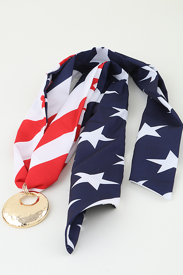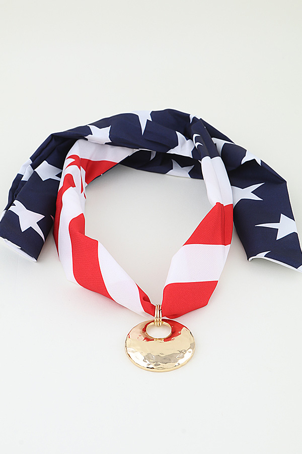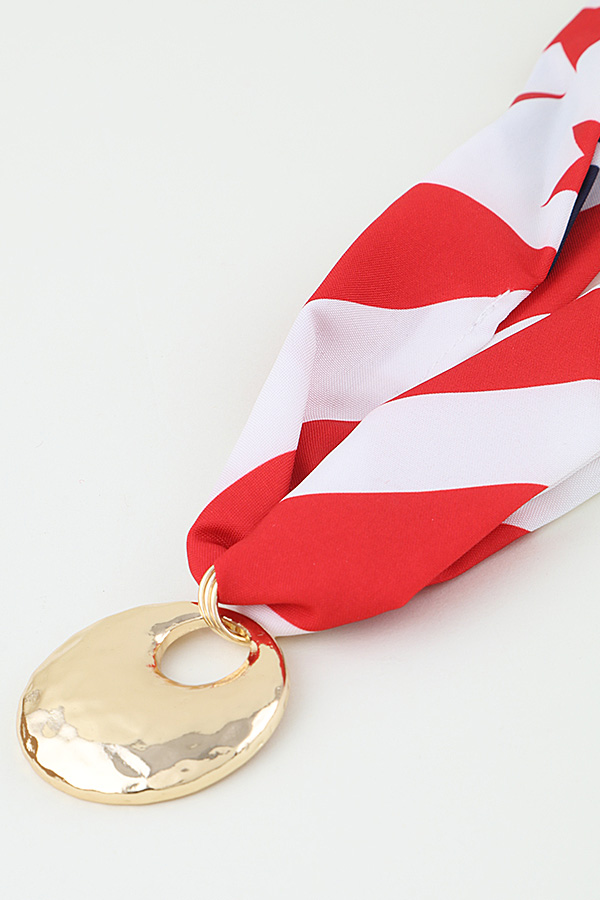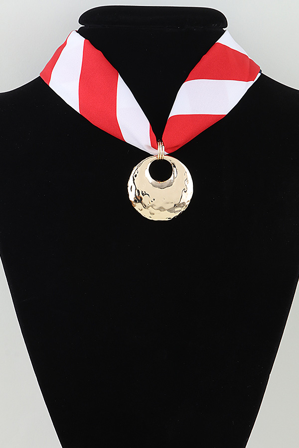- * This Hammered Moon Scarf Necklace from H&D Accessories combines a bold red-and-white striped scarf band with a large, textured hammered gold disc pendant, creating a striking, modern statement piece. Ideal for elevating office blouses, casual tees, or evening wear, it adds a sophisticated, artistic flair to any ensemble. The soft scarf material ensures comfortable all-day wear, while the hammered pendant catches light to create a luminous, eye-catching glow, making it a versatile accessory that effortlessly blends textile warmth with metallic luxury.