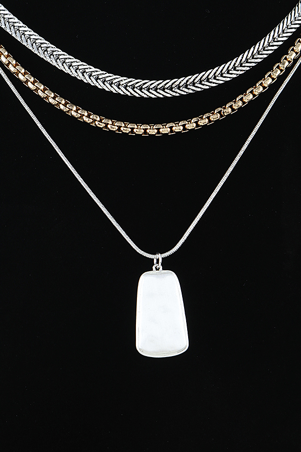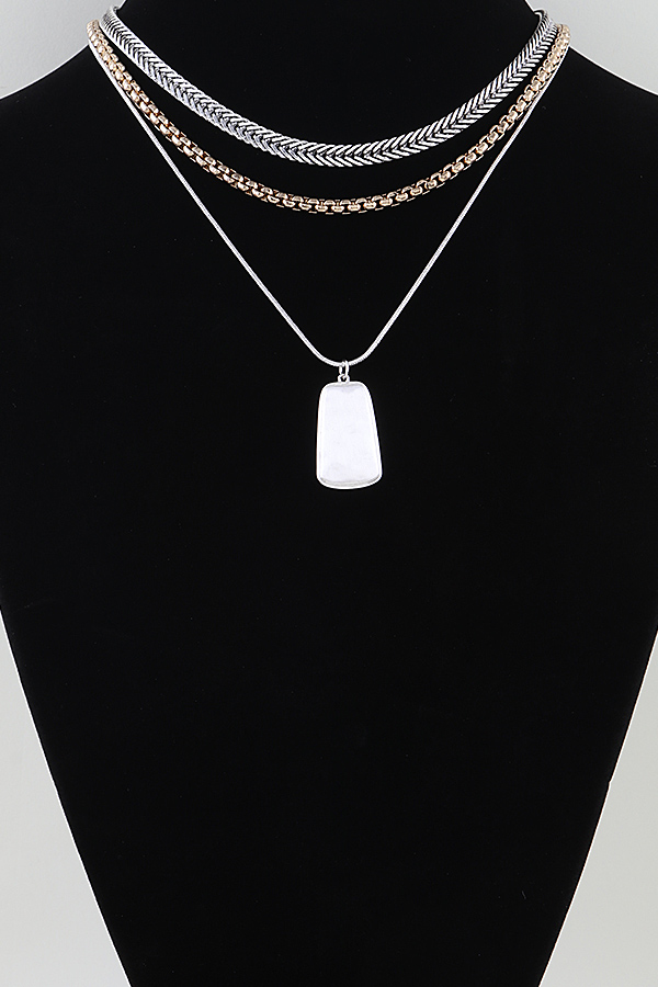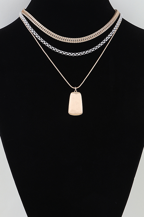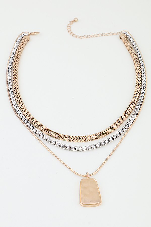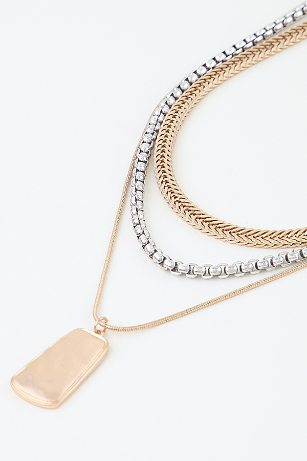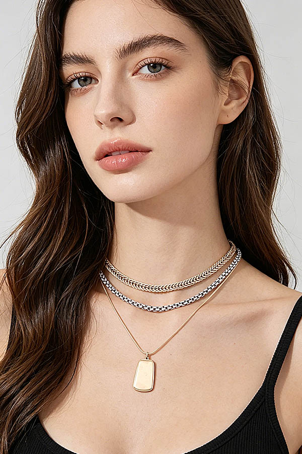- * This Multi Braided Pendant Chain Necklace from H&D Accessories features a layered design with two textured braided chains in contrasting metallic tones, paired with a sleek rectangular dog tag pendant on a delicate fine chain. Ideal for elevating casual tees, blouses, or office attire, it adds a modern, edgy yet refined touch to any ensemble. The mix of chunky woven textures and a minimalist pendant creates visual depth, while the layered structure offers effortless styling versatility, making it a go-to piece for everyday sophistication and statement-making looks.