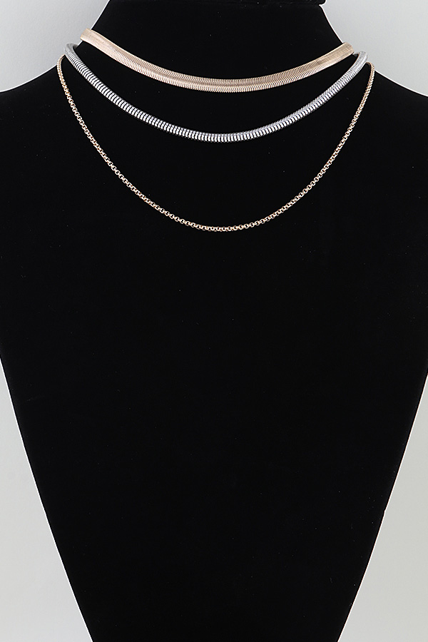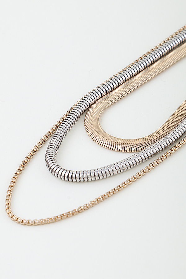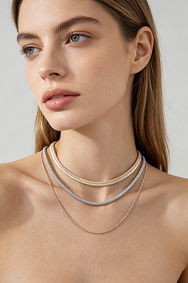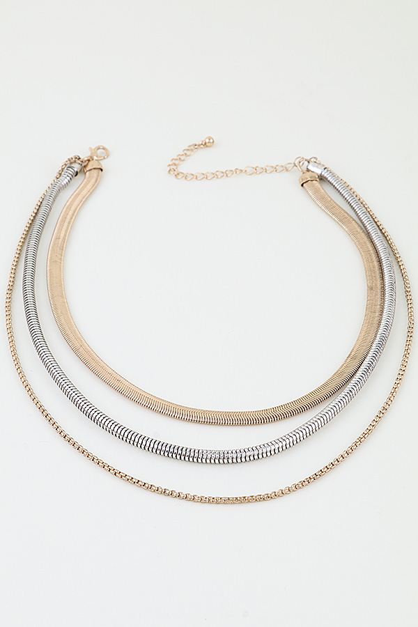 • * This Multi Snake Chain Choker Necklace from H&D Accessories features a layered design with three distinct chains: a wide gold snake chain, a sleek silver snake chain, and a delicate fine gold chain, creating a modern, textured look. Ideal for elevating casual tees, blouses, or evening wear, it adds a sophisticated, edgy focal point to any ensemble. The adjustable extender chain ensures a customizable fit, while the mix of metallic tones and chain textures offers effortless styling versatility, making it a go-to piece for contemporary, layered sophistication.