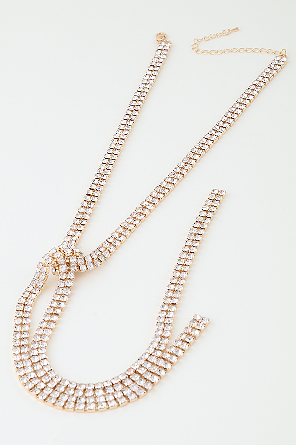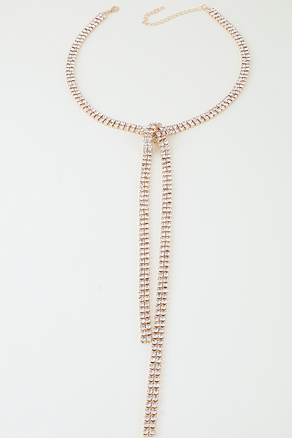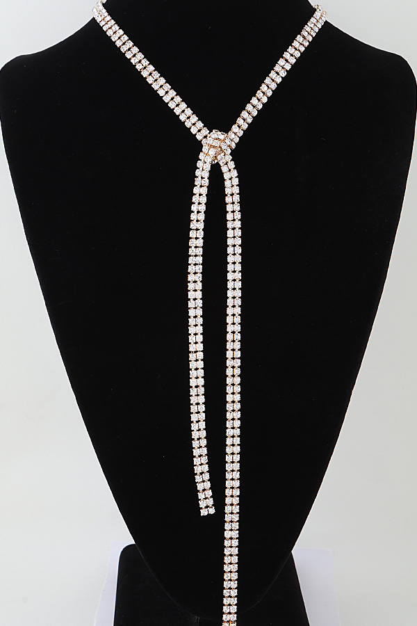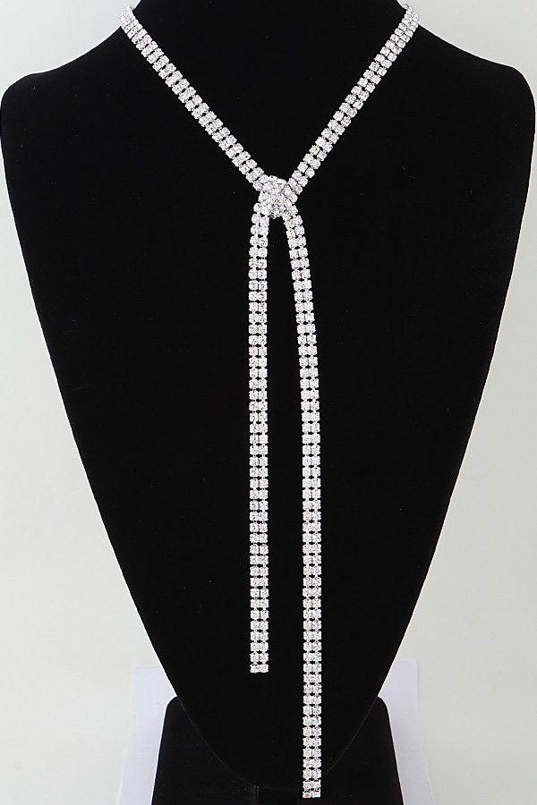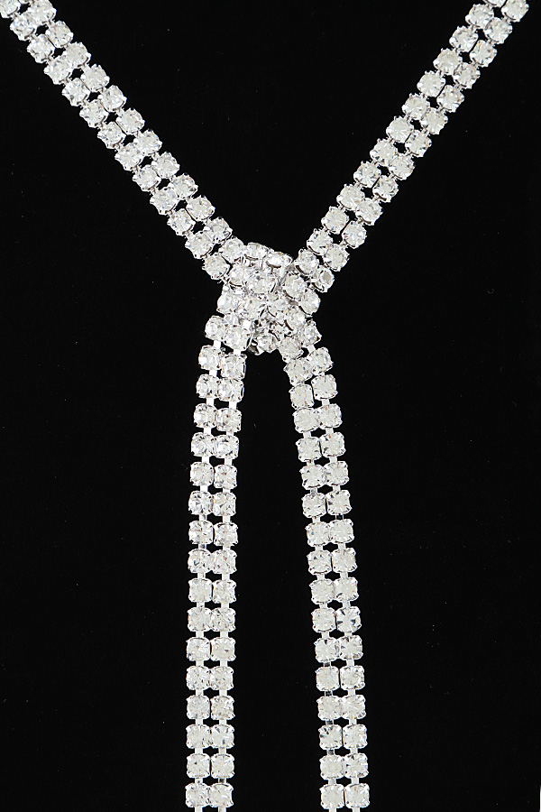 • * This is the Double Rhinestone Tie Drop Necklace, a striking accessory from H&D Accessories. It features a rhinestone-embellished double-strand design that forms a tie knot at the neck, then extends into two long, cascading drops, finished with a secure closure for comfortable wear. Perfect for adding a glamorous touch to formal or semi-formal looks—whether you’re dressing up for a cocktail party, a dinner gala, or a special occasion in a sleek neckline dress—this necklace serves as a bold focal point. Its dramatic, polished design elevates elegant ensembles, making it a standout choice to enhance memorable, stylish moments.