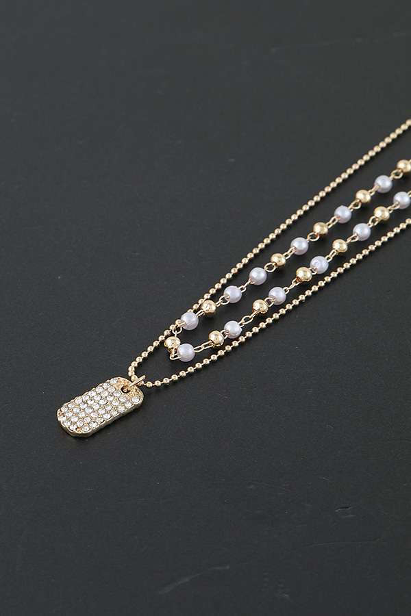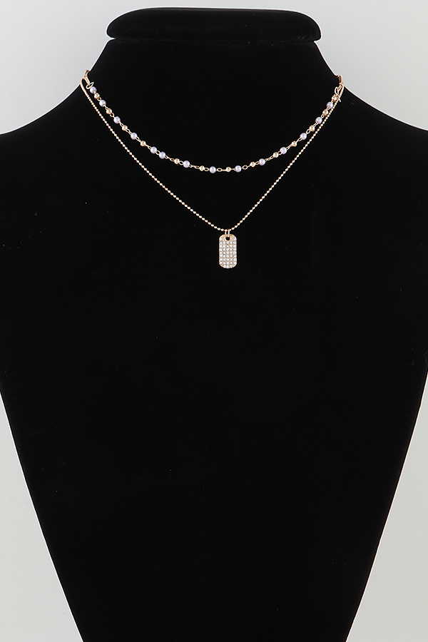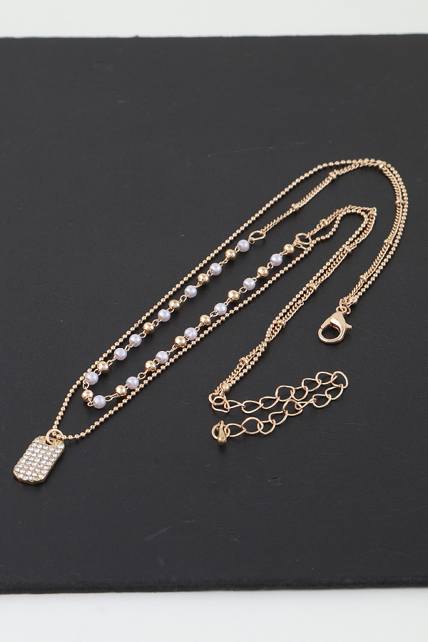 • * This is the Bejeweled Tag Beaded Necklace from H&D Accessories. It features a layered design, with one strand composed of small, evenly - spaced beads and the other a delicate chain. The focal point is a bejeweled tag pendant, intricately adorned with sparkling embellishments, adding a touch of luxury and charm. The craftsmanship is fine, creating a harmonious and stylish look.
