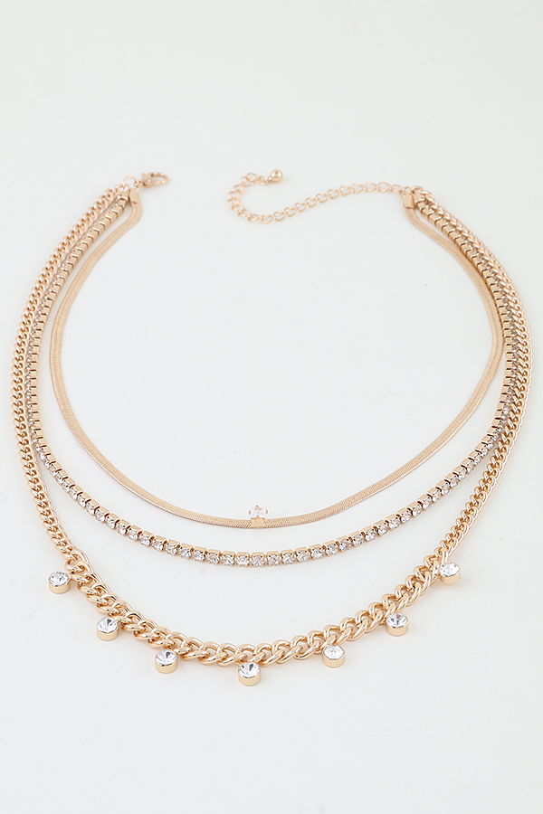 • * This is the Multi Rhinestone Chain Drop Necklace from H&D Accessories. It showcases a layered design with multiple chains of varying styles. The top chain is sleek and minimalist, while the middle chain is adorned with a continuous row of rhinestones. The bottom chain is a chunky link style, embellished with hanging rhinestone drops, creating a dynamic and eye - catching effect. The craftsmanship combines different chain textures and rhinestone embellishments for a luxurious look.