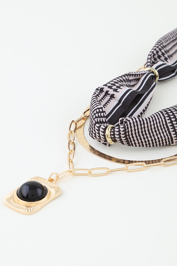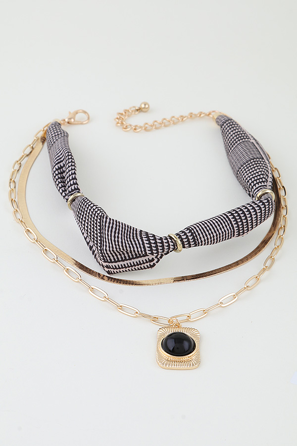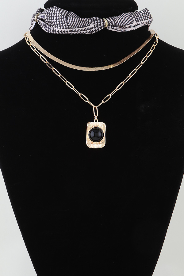 - * This Multi Layer Scarf Pendant Set from H&D Accessories offers a textured, layered aesthetic: it combines three distinct elements—an intricately patterned scarf choker, a slim smooth band, and a chain necklace anchored by a statement pendant. The pendant features a rectangular frame with detailed textured edges, centered around a solid, polished stone for subtle contrast.