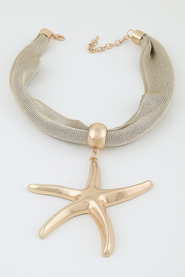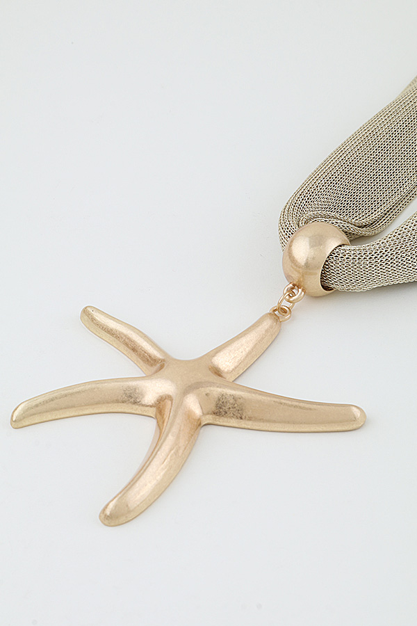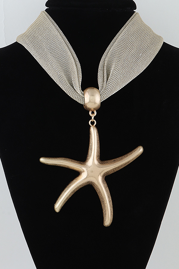 • * This is the Polished Starfish Fabric Wrap Necklace from H&D Accessories. It features a soft, mesh fabric wrap that fastens near the neck, paired with a spherical connector. Suspended from the connector is a large, polished starfish pendant with a sculpted, dimensional shape. The design blends the lightweight texture of the fabric wrap with the bold, smooth silhouette of the starfish, creating a distinctive piece that balances softness and statement detail.