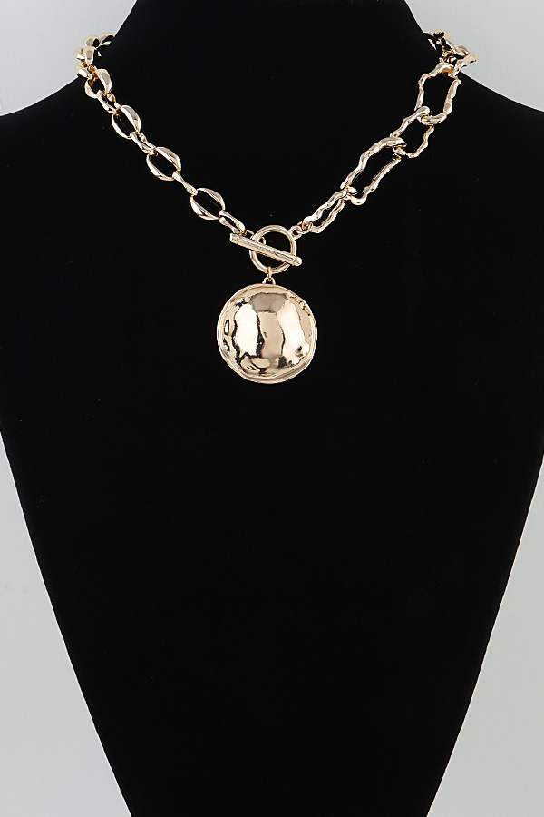 - * This is the Hammered Plate Toggle Chain Necklace from H&D Accessories. It features a mixed-link chain (combining smooth and textured links) paired with a prominent toggle clasp. Suspended from the clasp is a round, hammered plate pendant, which adds a textured, dimensional detail. The design balances structured chain elements with the organic finish of the pendant, creating a bold yet refined piece that serves as a striking focal point for any ensemble.