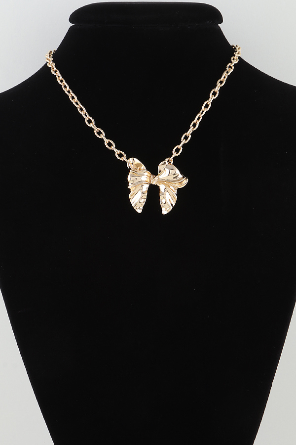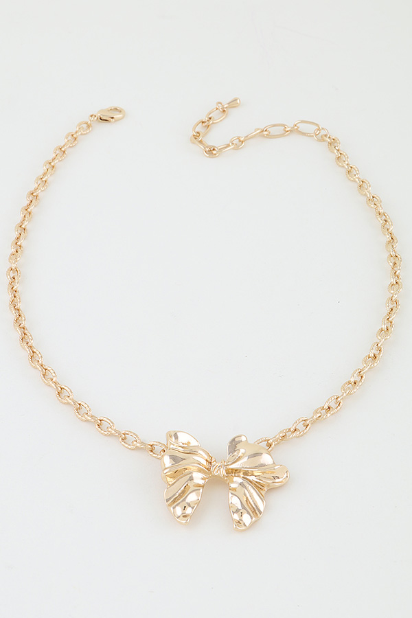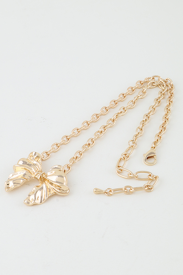 - * This Shiny Ribbon Link Chain Necklace from H&D Accessories is a sophisticated and stylish accessory. It features a delicate link chain that elegantly drapes around the neck, with a prominent, intricately designed bow pendant. The bow, with its shiny surface and detailed texture, adds a touch of femininity and charm.