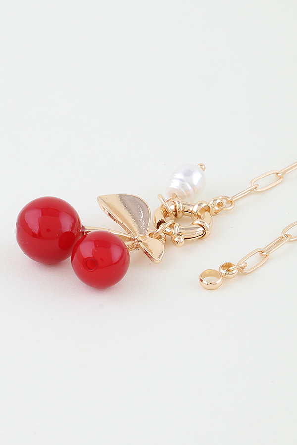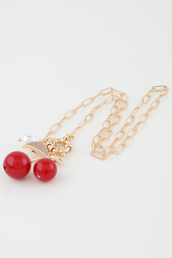 - * The Pearled Cherry Toggle Necklace from H&D Accessories is a delightful piece. It features a delicate gold - toned chain with a toggle clasp, adorned with a charming pendant. The pendant showcases two glossy red cherries, a gold - leaf detail, and a small white pearl, creating a sweet and elegant look.