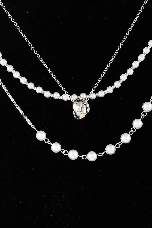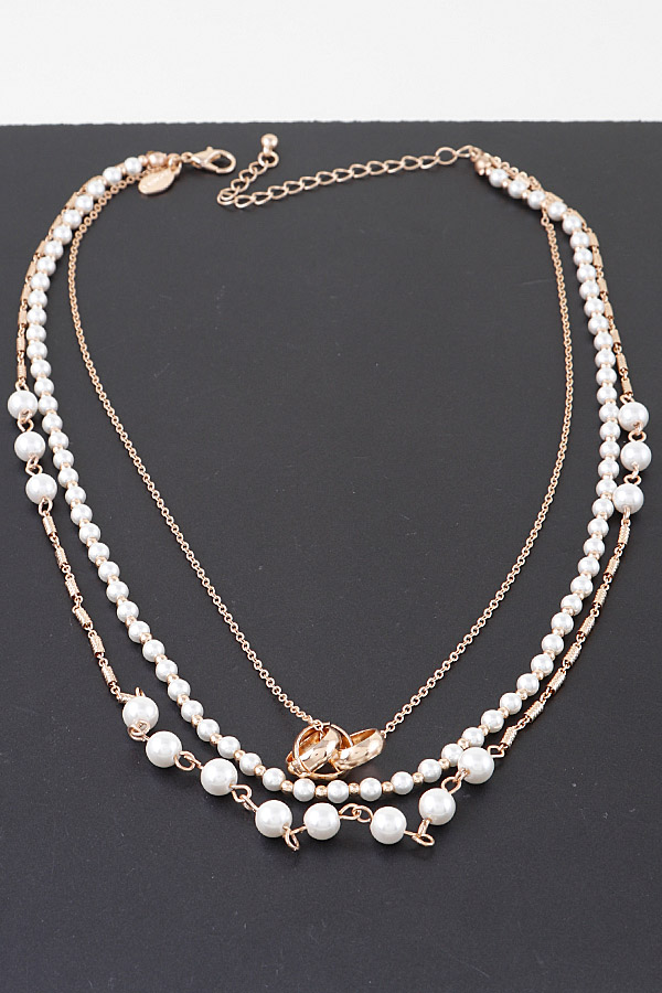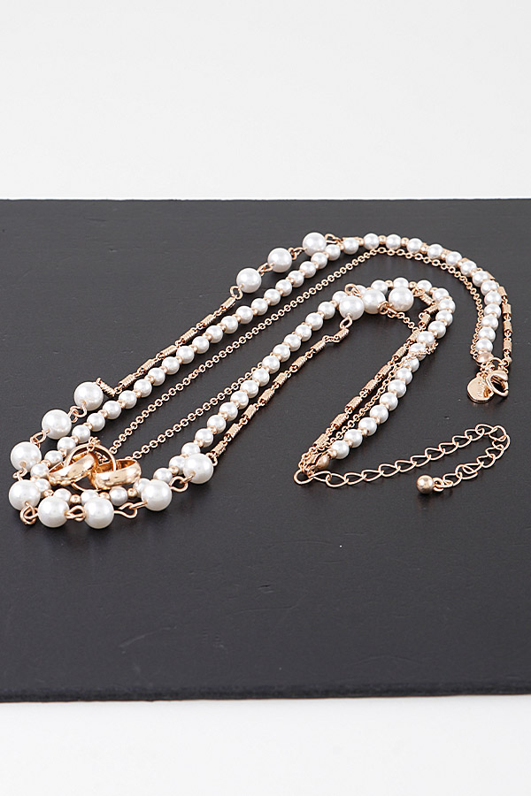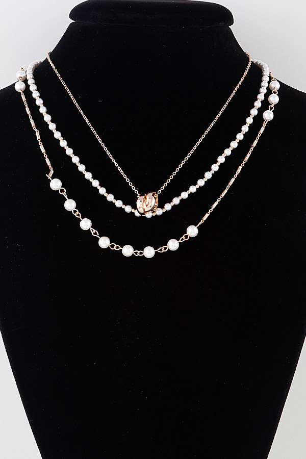 - * Elevate your elegance with the "Triple Ring Beaded Necklace"! This exquisite three-strand pearl necklace, beautifully intertwined with a luxurious gold chain, is the perfect accessory to enhance any outfit. Make a statement and let your style shine with this stunning piece from H&D Accessories.