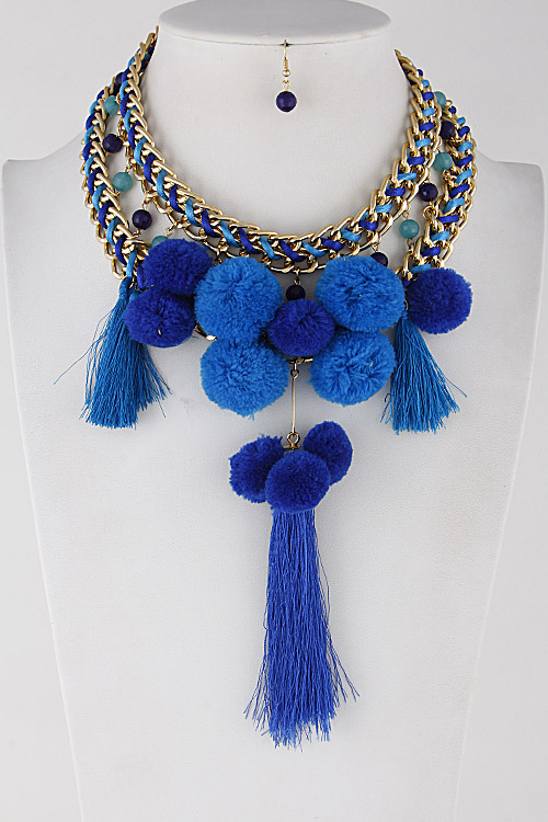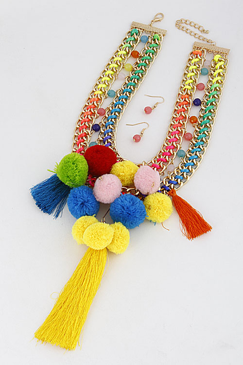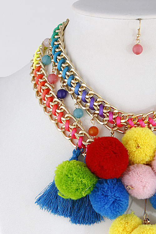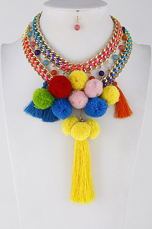- * Bright Pom And Tassel Trendy Necklace 7EAB8 * 1.5 X 16" Approx.