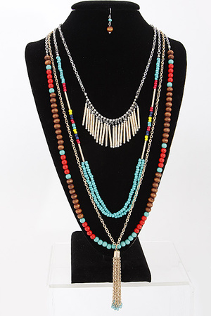 Long Beaded Layered Necklace With Tassel Set 6BAG6