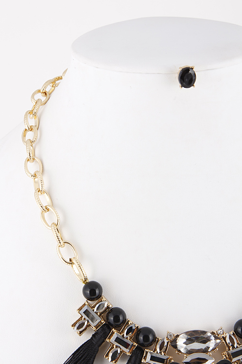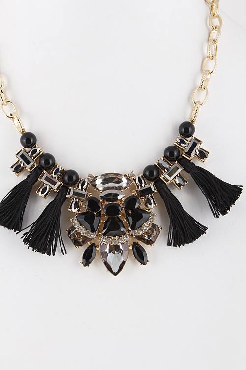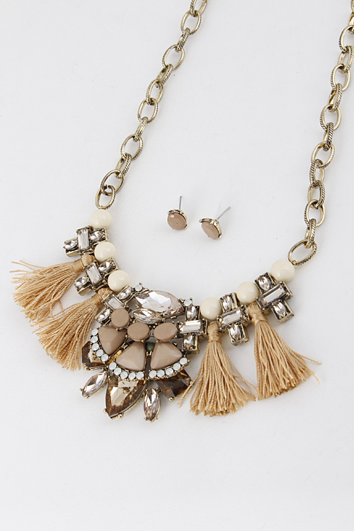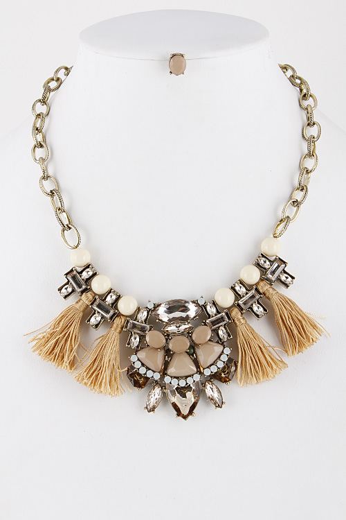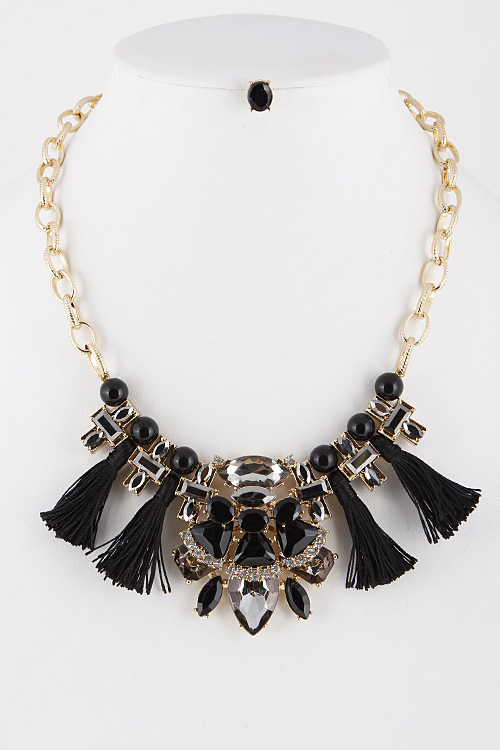 • * Egyptian Cluster of Rhinestone and Tassel Necklace Set 5IDA4 * 10" approx.