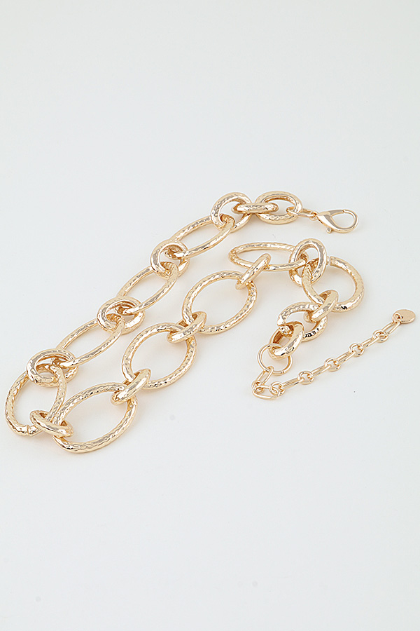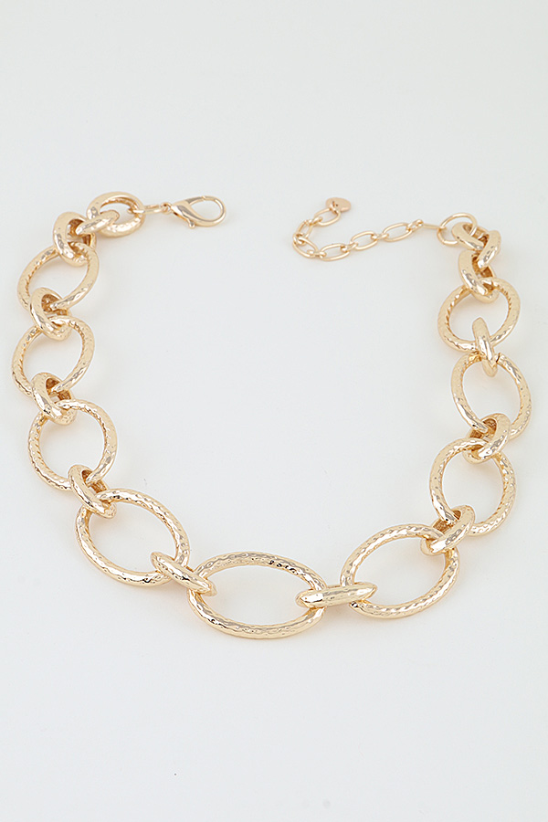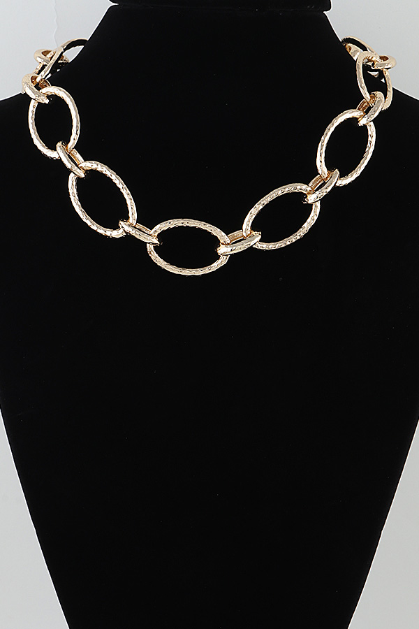- * This Indented Hoop Chain Statement Necklace from H&D Accessories features linked, oval-shaped hoops with a textured, indented finish that adds subtle dimension to its bold, sleek design. The close-fitting silhouette creates a striking focal point, balancing modern edge with polished charm. It’s perfect for elevating a tailored blazer during a professional event, or for adding a sophisticated touch to a simple slip dress at a dinner party, blending eye-catching structure with versatile style that suits both formal and dressy casual occasions.