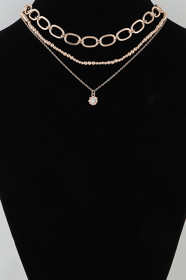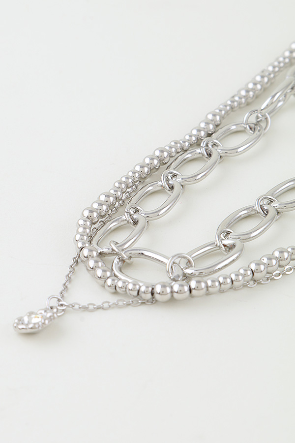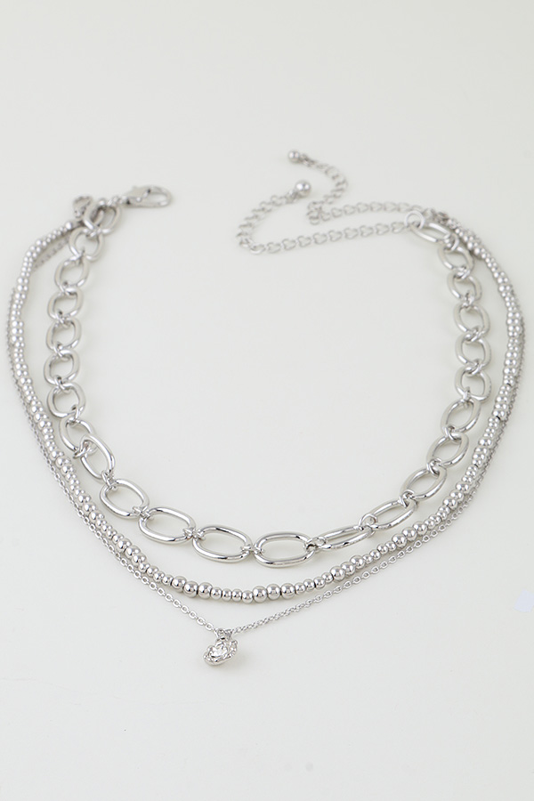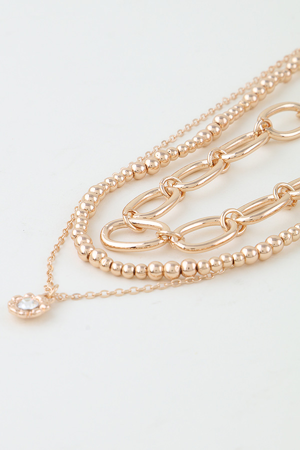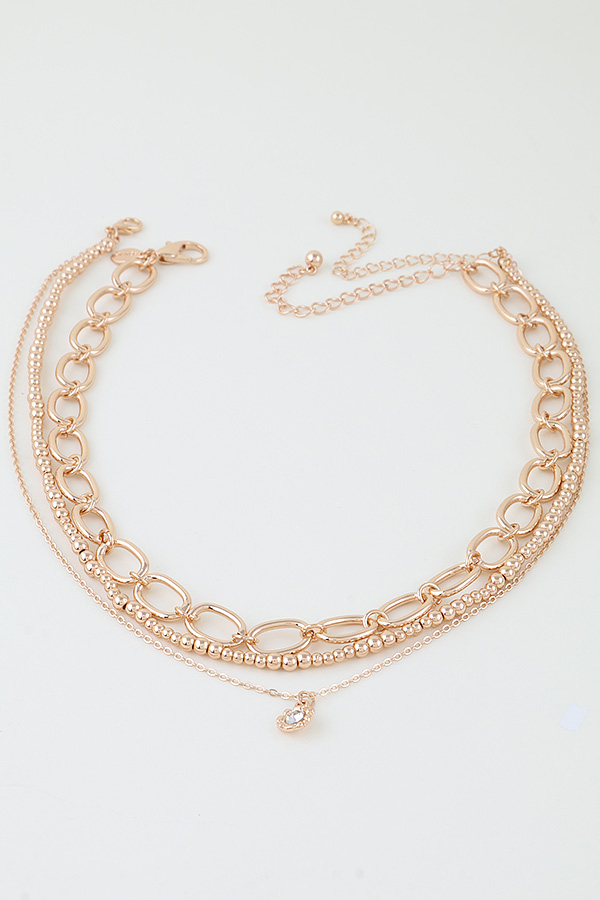 - * This Layer Luxe Chain Necklace from H&D Accessories features a multi-strand design that blends varied textures: a bold chain of large, smooth oval links forms the central layer, flanked by a strand of small, densely packed bead-like elements, plus a delicate fine chain. A tiny, faceted stone pendant dangles from the thinnest strand, adding subtle sparkle.