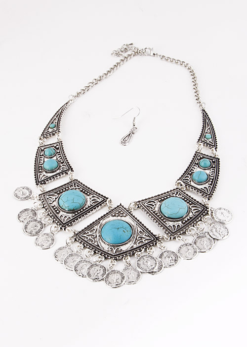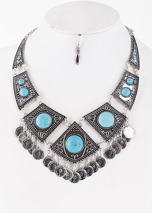 • * Turquoise Stone Bead Panel Statement Necklace 5ECA5 * 18" approx.