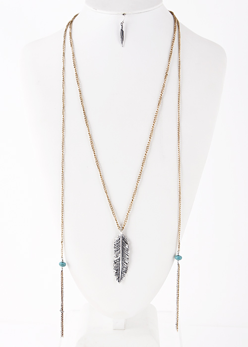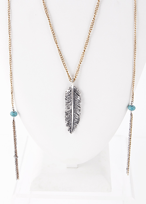 • * Feather Pendant Bead Necklace 5ECC13 * 26 x 2.5 approx.