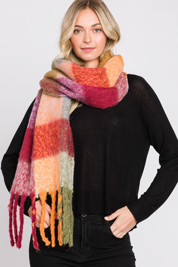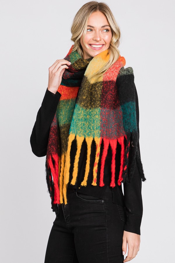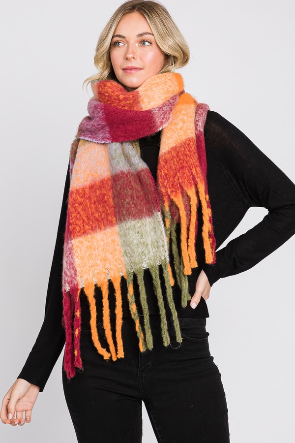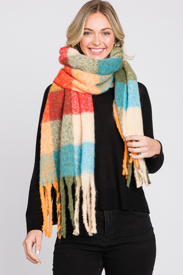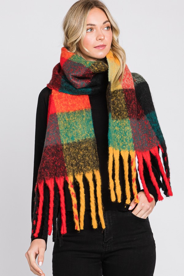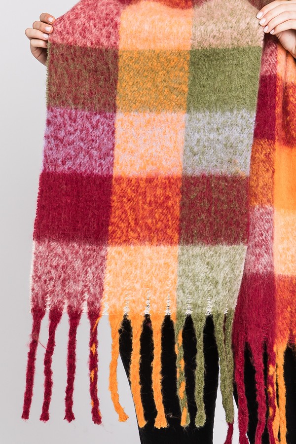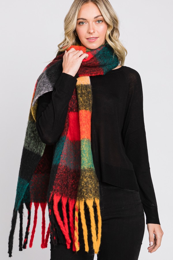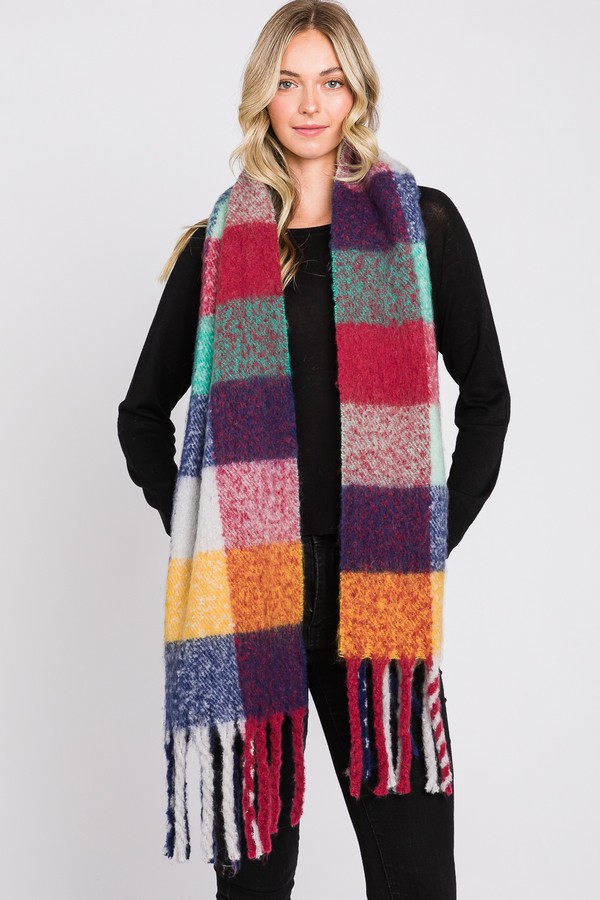 - * Brushed Multi Color Plaid Scarf With Fringe
