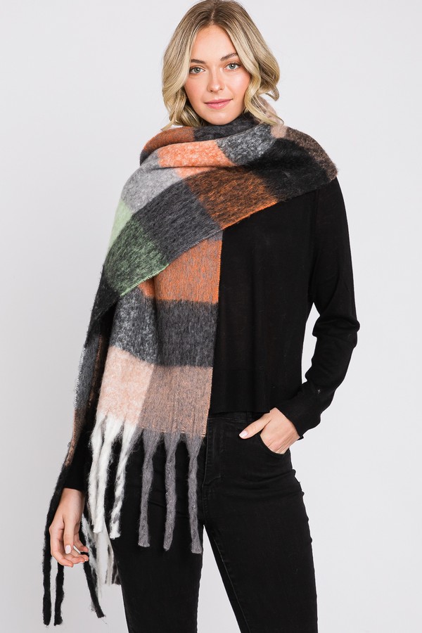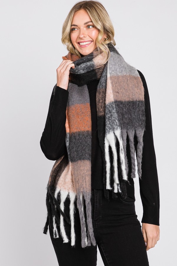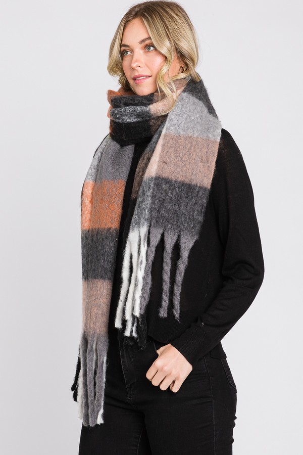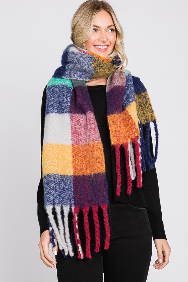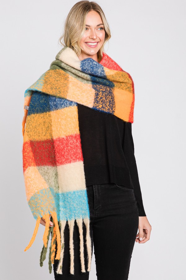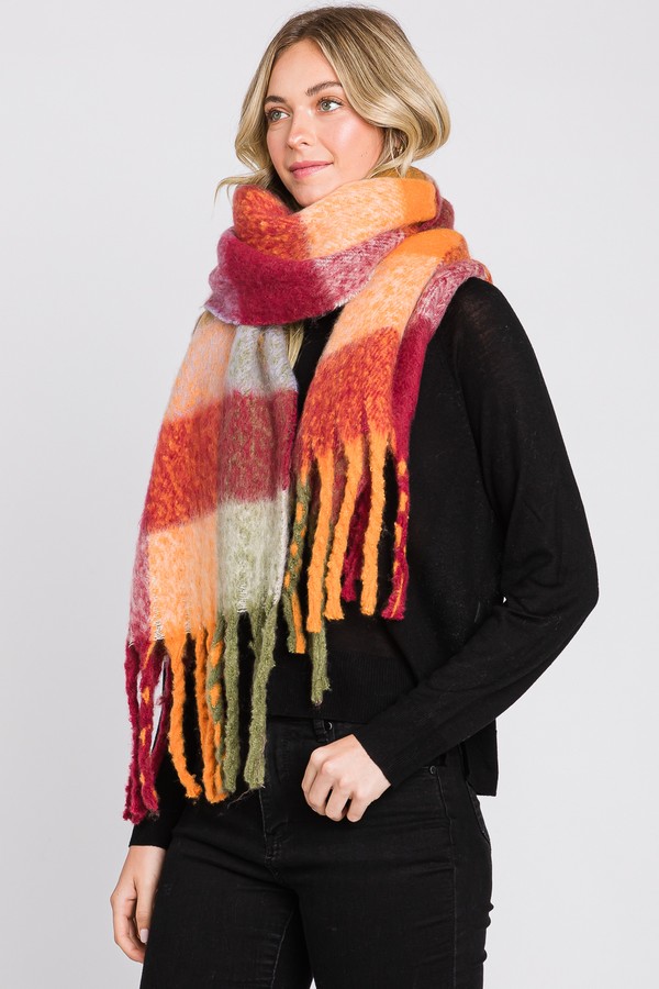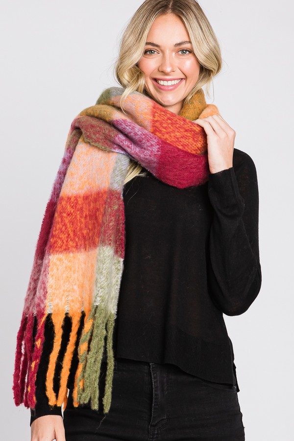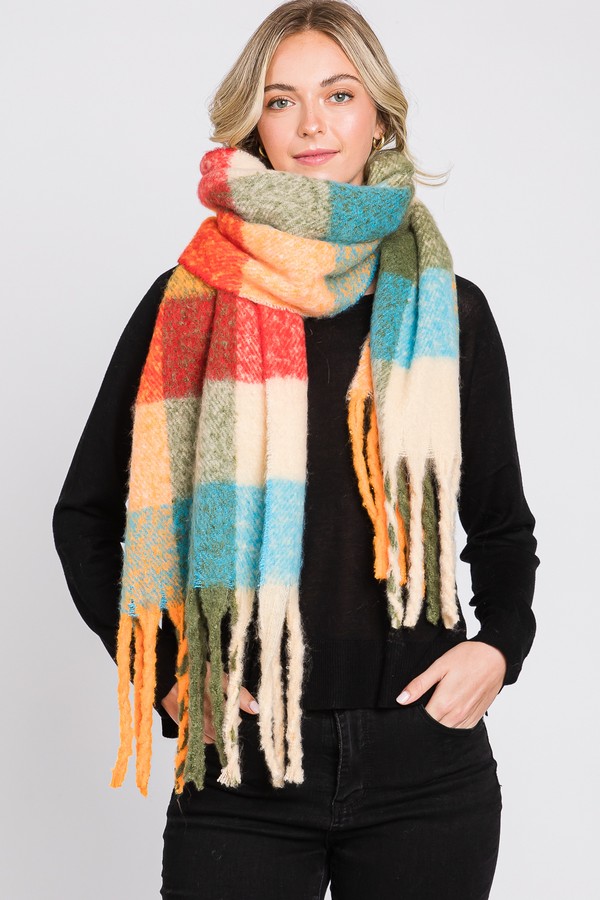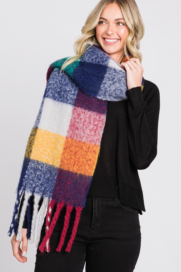 - * Brushed Multi Color Plaid Scarf With Fringe