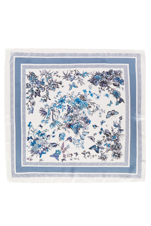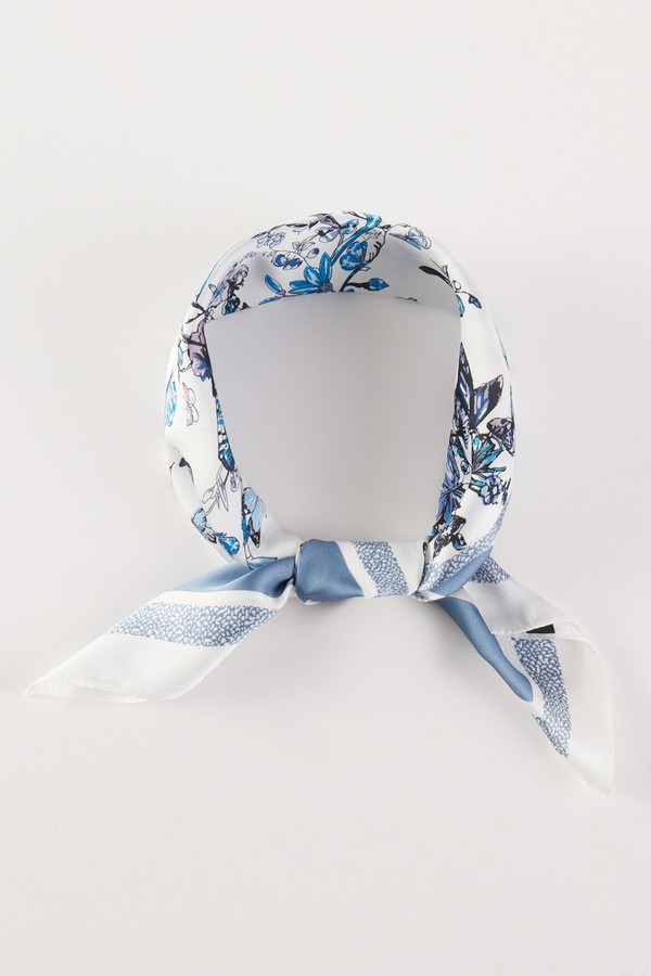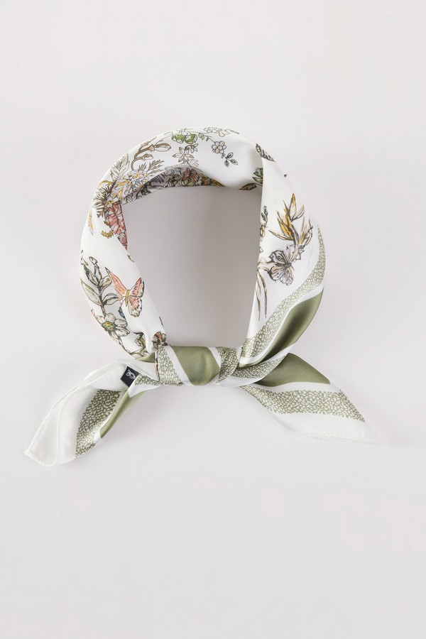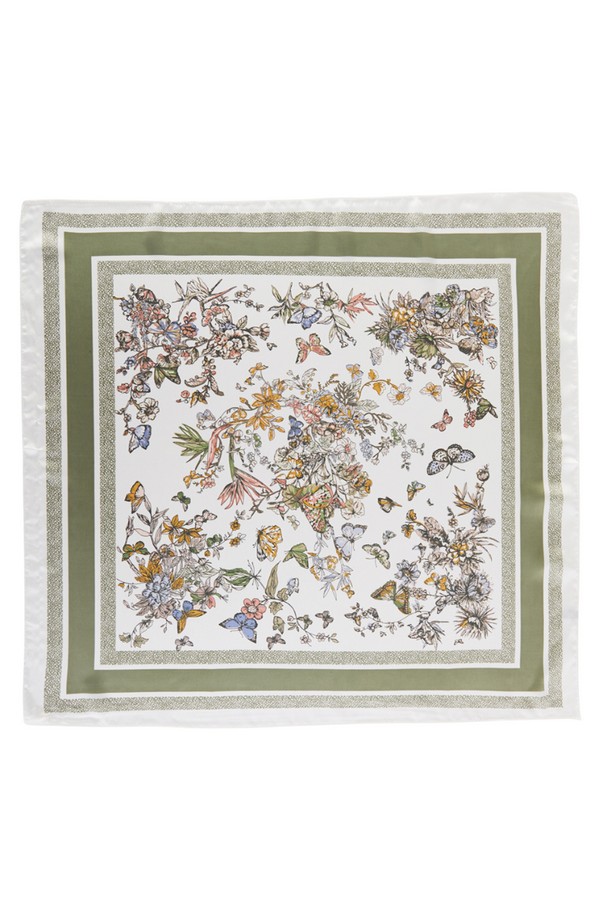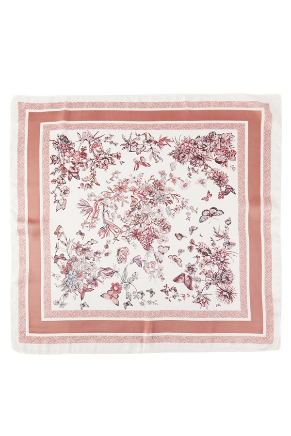 - * This is a FLORAL PATTERN BANDANA from H&D Accessories. It showcases an intricate design with a variety of flowers and butterflies. The flowers are detailed and arranged in a natural, scattered way, while the butterflies add a lively touch. The bandana has a bordered structure, enhancing the overall elegance of the floral and butterfly motifs.