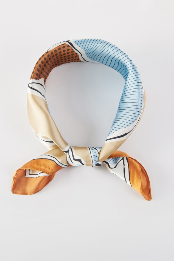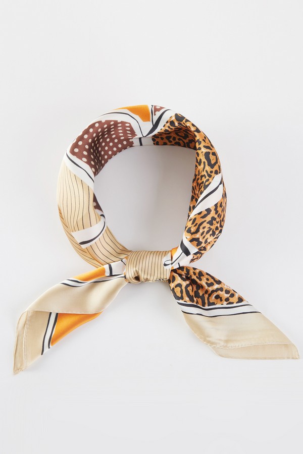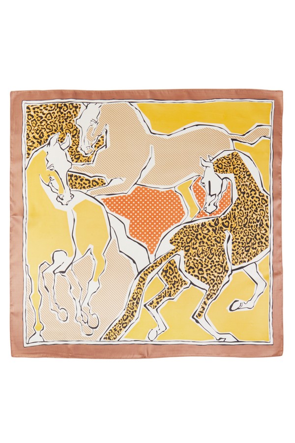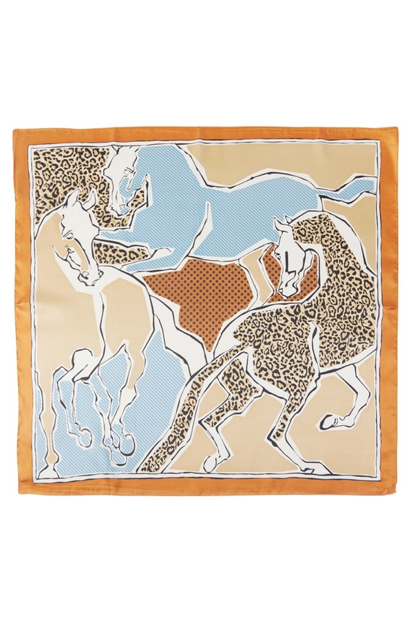 - * This is a Leopard Pattern Mixed Horse Bandana from H&D Accessories. In the decorative art style of block - splicing and line - outlining, four simply - shaped horses are presented. Some of the horses have solid - colored bodies while others feature leopard patterns. The background consists of a simple pattern formed by yellow, orange, and brown color blocks. The overall composition is well - structured with a bright color scheme and no text.