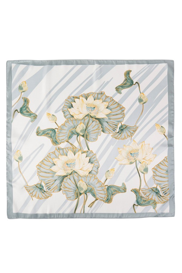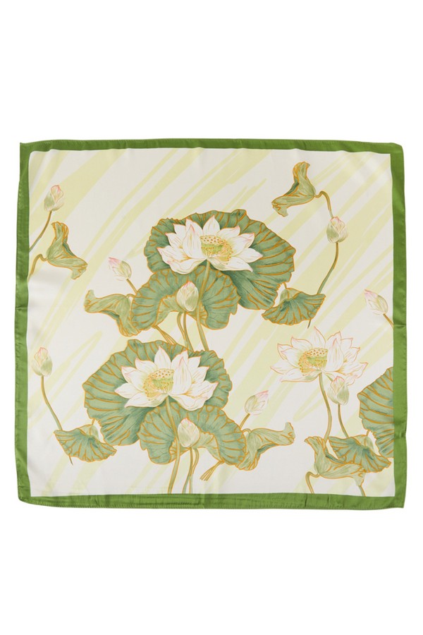 - * This is a Floral Pattern Bandana from H&D Accessories. It features a design of lotus flowers and leaves, with the blooms and foliage arranged in a natural, flowing manner. The pattern incorporates large lotus blossoms, buds, and broad leaves, creating an elegant and serene botanical motif. The overall layout is balanced, showcasing the beauty of the floral elements against a backdrop with linear textures