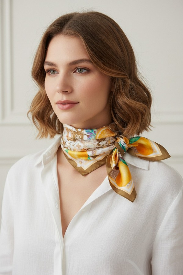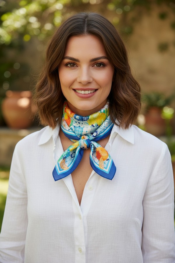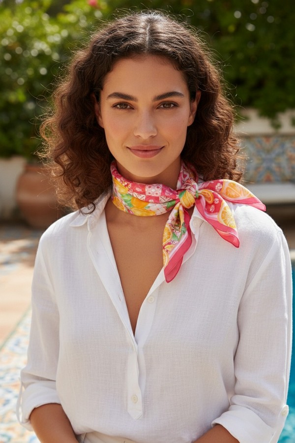- * This Citrus Mosaic Print Bandana from H&D Accessories features a vibrant blend of fresh fruit motifs and intricate tile-inspired patterns, set within a bold border, made from a soft, lightweight fabric. It can be tied around the neck to add a bright, lively touch to a casual linen dress for a weekend brunch, or worn as a headscarf to keep hair shaded during a trip to the farmers’ market. Its versatile design also works as a bag accent, bringing a sunny, Mediterranean-inspired vibe to any warm-weather outfit.
