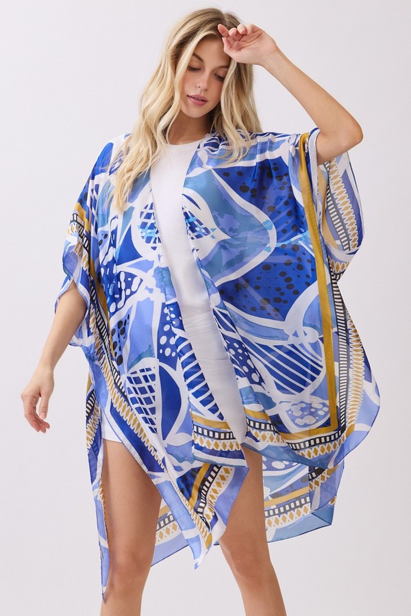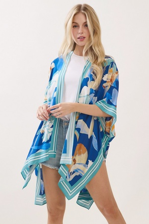 TWO TONES TRIM ABSTRACT PRINT SILKY FEEL KIMONO.