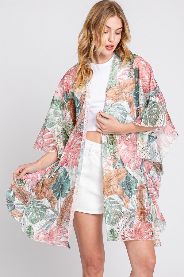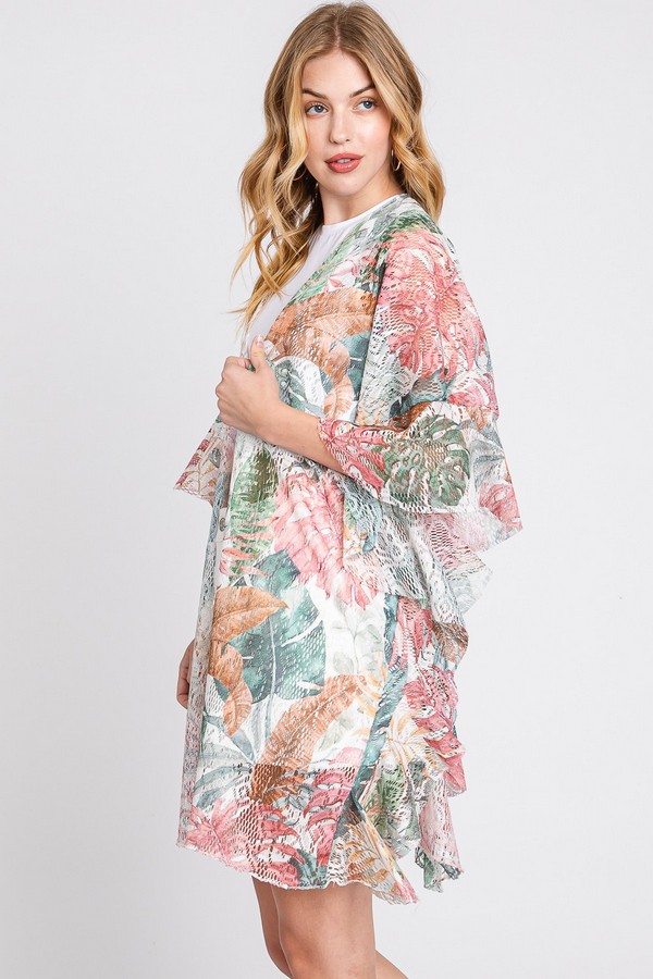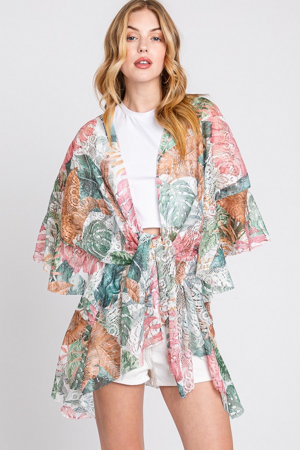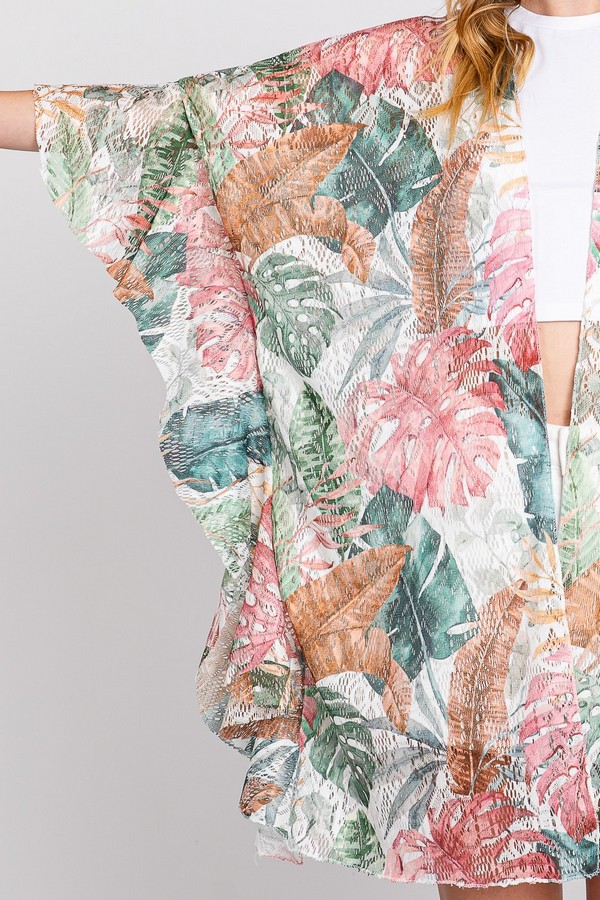 - * RUFFLE LINED TROPICAL LEAVES PRINT OPEN FRONT CROCHET COVER UP.