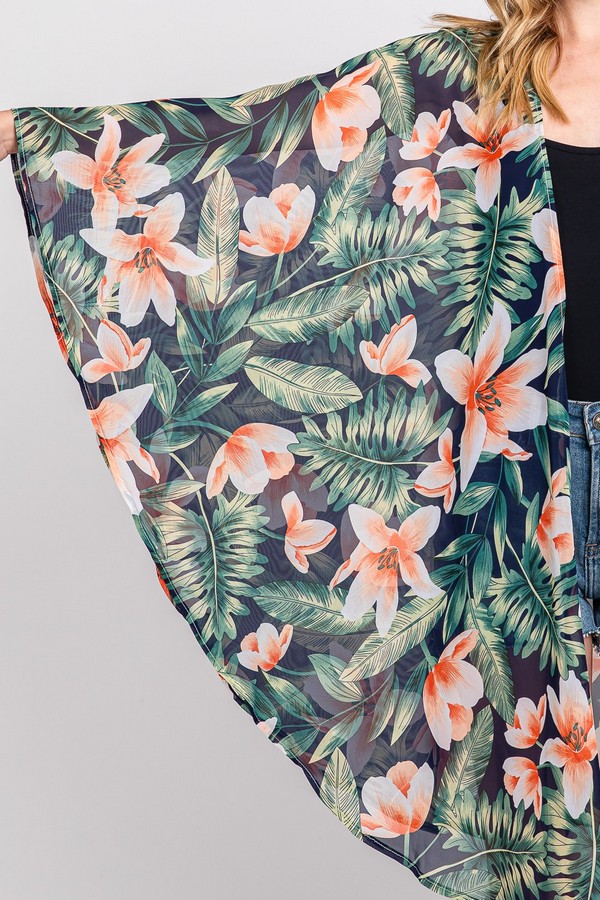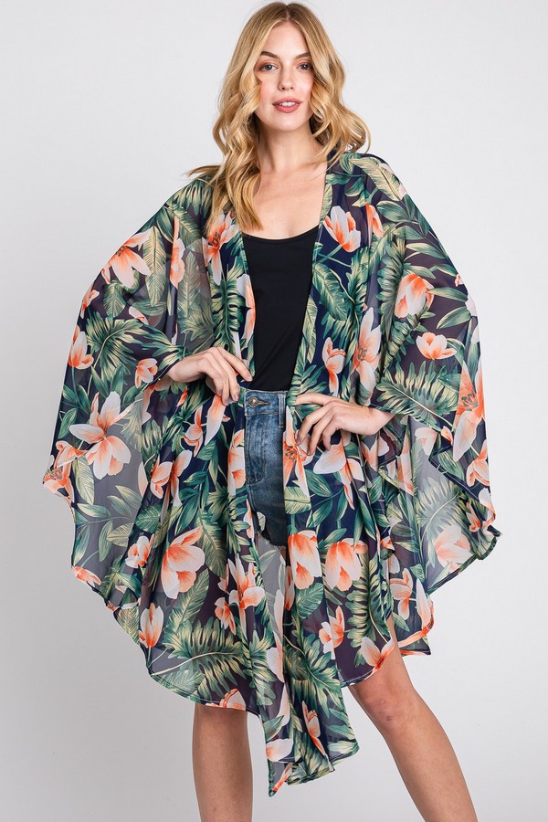 - * TROPICAL FLOWER LEAVES PRINT SHAWL COVER-UP.