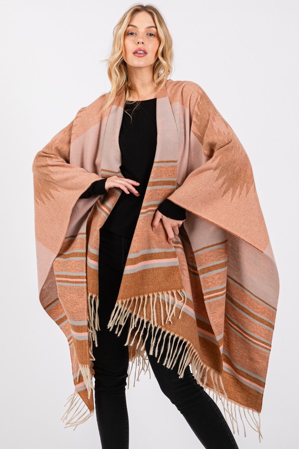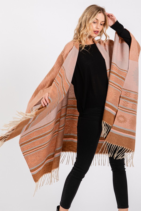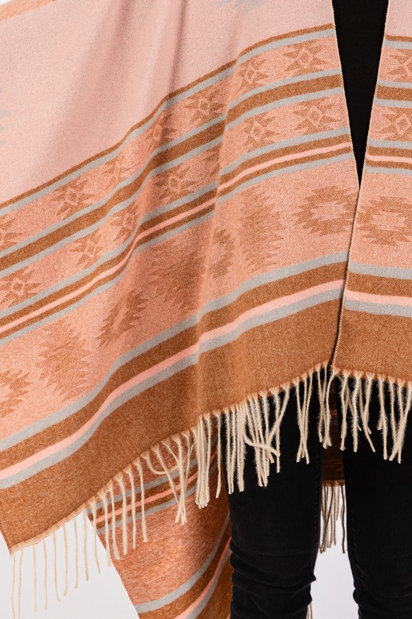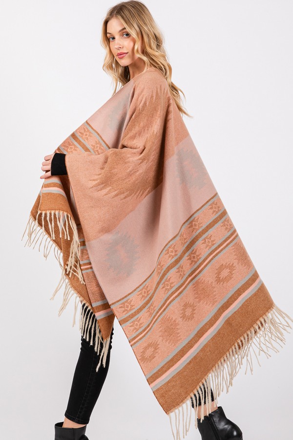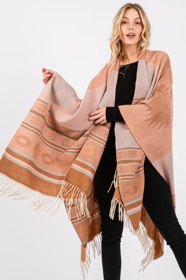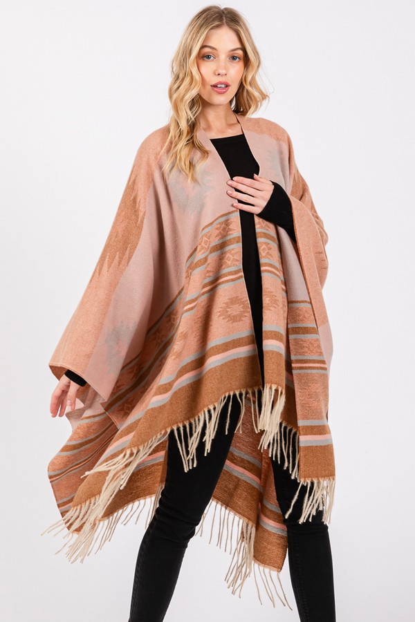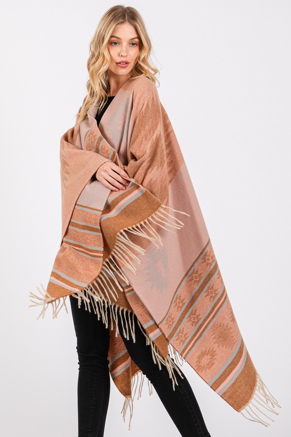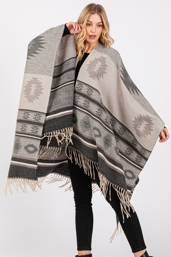 - * Elevate your winter wardrobe with the Aztec Pattern Fringe Ruana from H&D Accessories! This poncho features a beautiful Aztec pattern and fringe detail for a touch of bohemian flair.